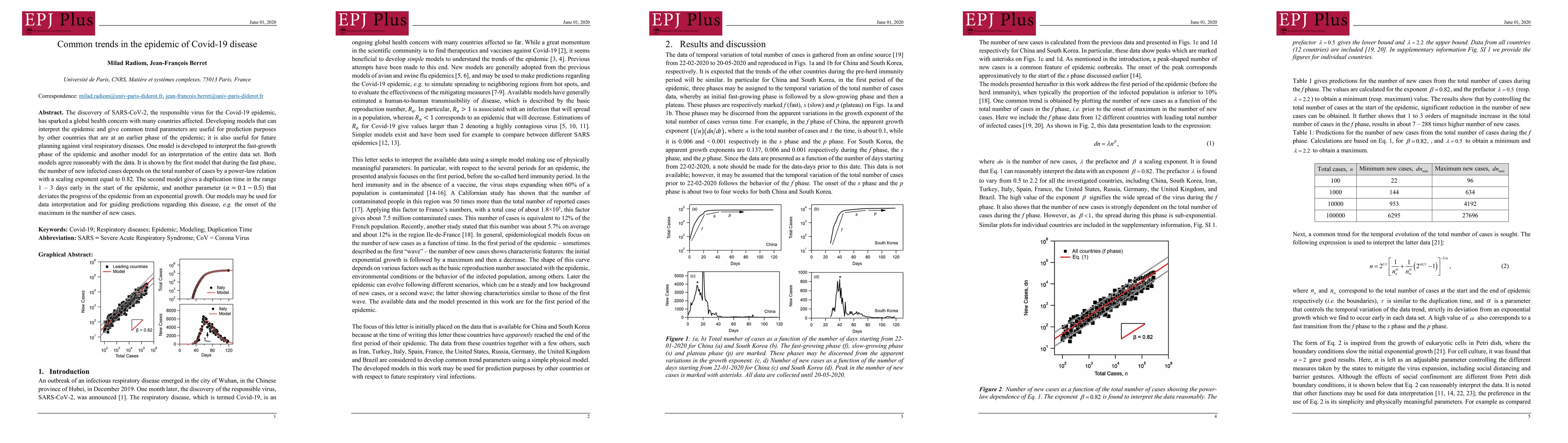 The discovery of SARS-CoV-2, the responsible virus for the Covid-19 epidemic, has sparked a global health concern with many countries affected. Developing models that can interpret the epidemic and give common trend parameters are useful for prediction purposes by other countries that are at an earlier phase of the epidemic; it is also useful for future planning against viral respiratory diseases. One model is developed to interpret the fast-growth phase of the epidemic and another model for an interpretation of the entire data set. Both models agree reasonably with the data. It is shown by the first model that during the fast phase, the number of new infected cases depends on the total number of cases by a power-law relation with a scaling exponent equal to 0.82. The second model gives a duplication time in the range 1 to 3 days early in the start of the epidemic, and another parameter alpha = 0.1-0.5) that deviates the progress of the epidemic from an exponential growth. Our models may be used for data interpretation and for guiding predictions regarding this disease, e.g. the onset of the maximum in the number of new cases.