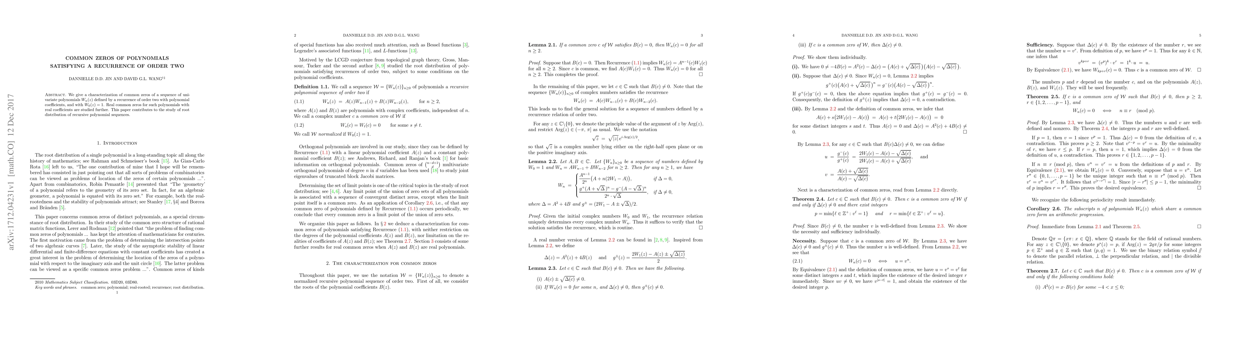 Researchers characterized common zeros of polynomials with a recurrence of order two, focusing on real coefficients and root distribution. They contributed to the study of recursive polynomial sequences.