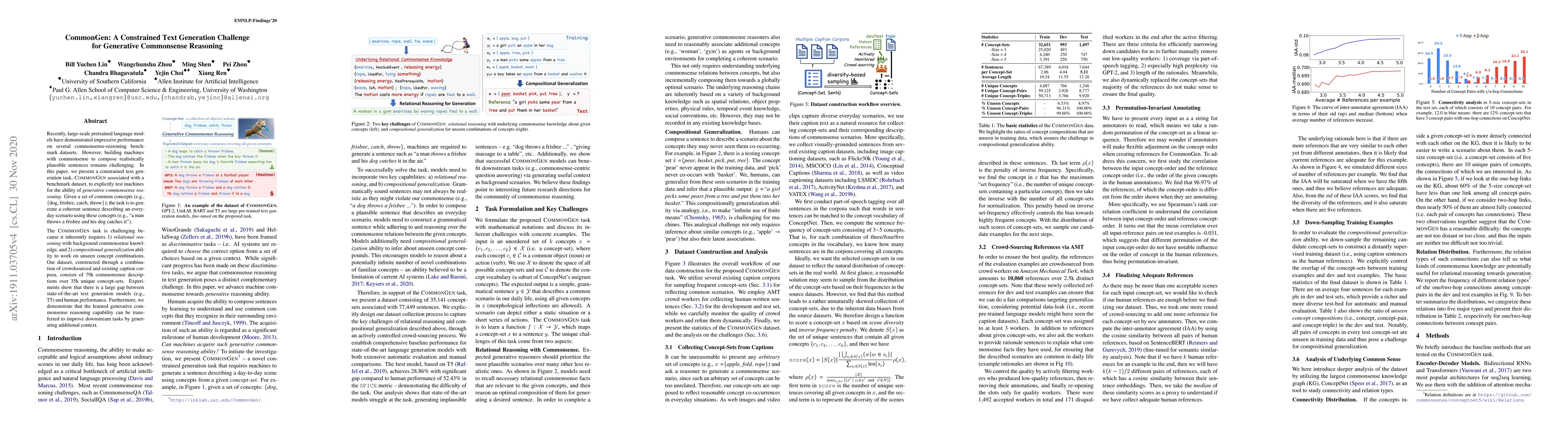 The paper introduces CommonGen, a constrained text generation challenge designed to test generative commonsense reasoning, and presents a benchmark dataset of 79k descriptions over 35k unique concept-sets. The task shows a significant performance gap between state-of-the-art models and humans, highlighting the need for improved generative commonsense reasoning.