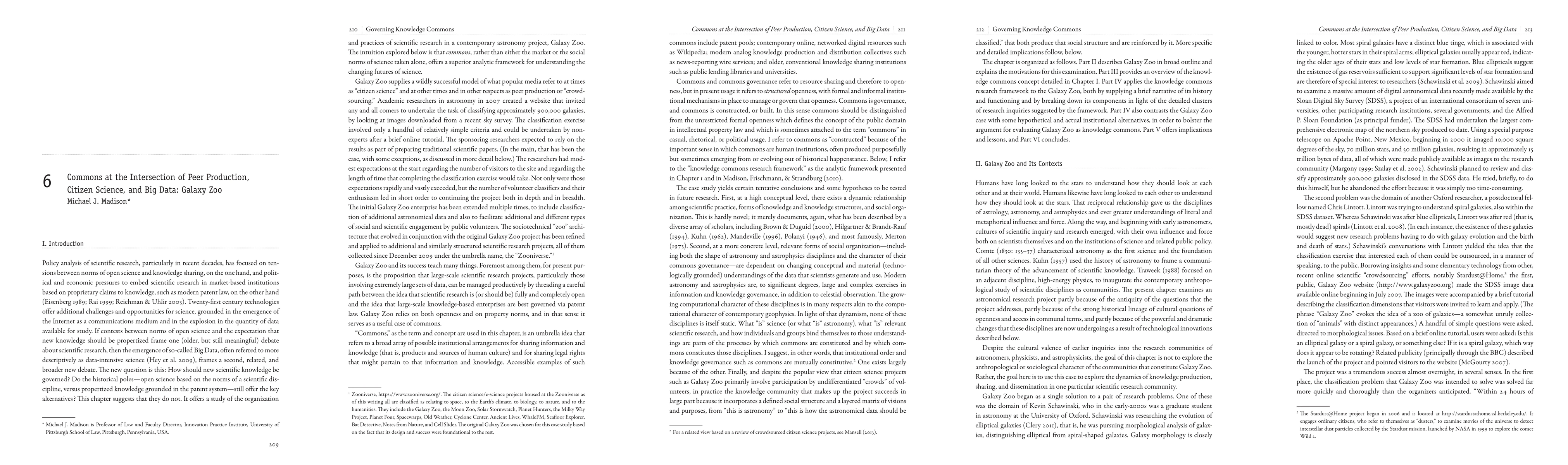 The knowledge commons research framework is applied to a case of commons governance grounded in research in modern astronomy. The case, Galaxy Zoo, is a leading example of at least three different contemporary phenomena. In the first place Galaxy Zoo is a global citizen science project, in which volunteer non-scientists have been recruited to participate in large-scale data analysis via the Internet. In the second place Galaxy Zoo is a highly successful example of peer production, sometimes known colloquially as crowdsourcing, by which data are gathered, supplied, and/or analyzed by very large numbers of anonymous and pseudonymous contributors to an enterprise that is centrally coordinated or managed. In the third place Galaxy Zoo is a highly visible example of data-intensive science, sometimes referred to as e-science or Big Data science, by which scientific researchers develop methods to grapple with the massive volumes of digital data now available to them via modern sensing and imaging technologies. This chapter synthesizes these three perspectives on Galaxy Zoo via the knowledge commons framework.