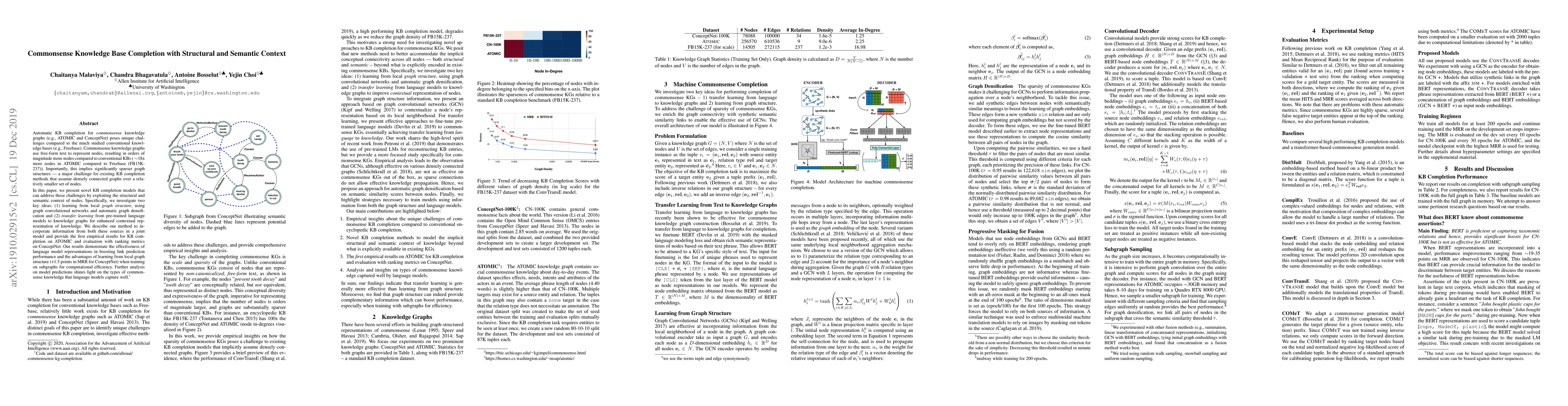 This paper proposes novel methods for completing commonsense knowledge graphs using structural and semantic context. It introduces graph convolutional networks and automatic graph densification, alongside transfer learning from pre-trained language models to enhance contextual representation, achieving better link prediction performance and demonstrating computational efficiency.