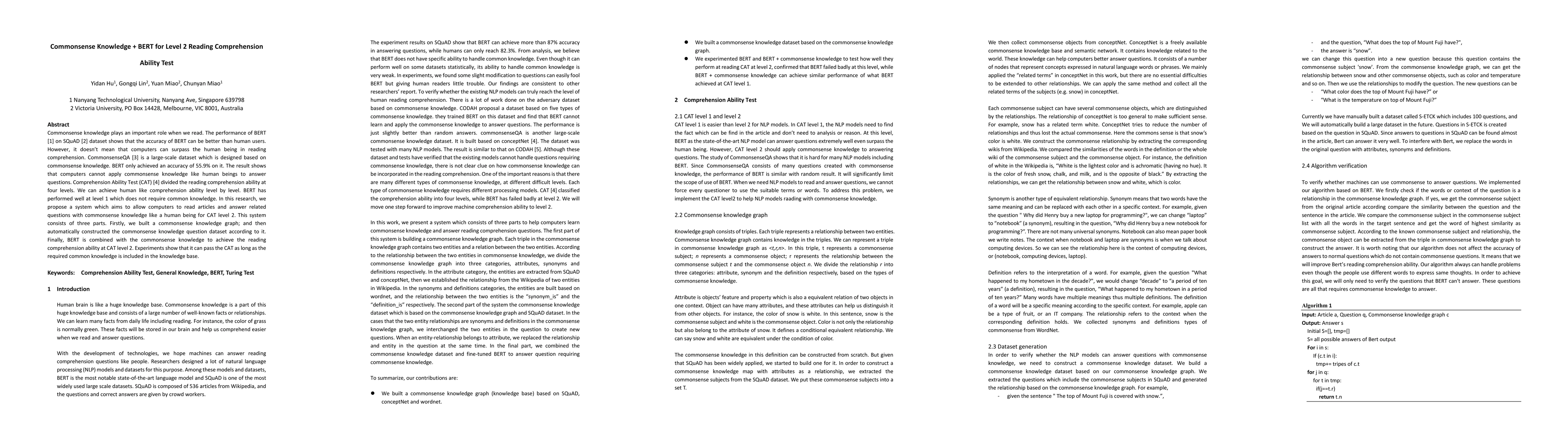 This research proposes a system to enhance BERT's reading comprehension to CAT level 2 by integrating commonsense knowledge, using a knowledge graph and a constructed commonsense question dataset. Experiments demonstrate that BERT can achieve human-like comprehension at this level when provided with relevant common knowledge.