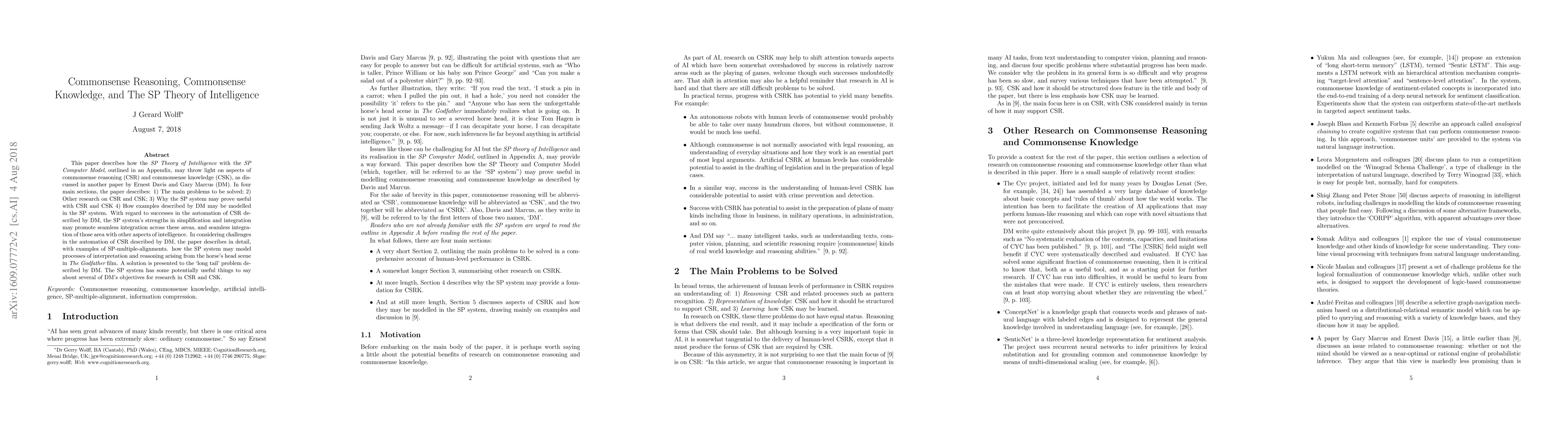 This paper proposes the SP Theory of Intelligence and its computer model to shed light on commonsense reasoning and knowledge, addressing problems, comparing with existing research, and demonstrating how examples from DM's paper can be modeled in the SP system. The SP model's strengths in simplification and integration are highlighted to tackle challenges in CSR automation, with a detailed solution to DM's 'long tail' problem presented.
