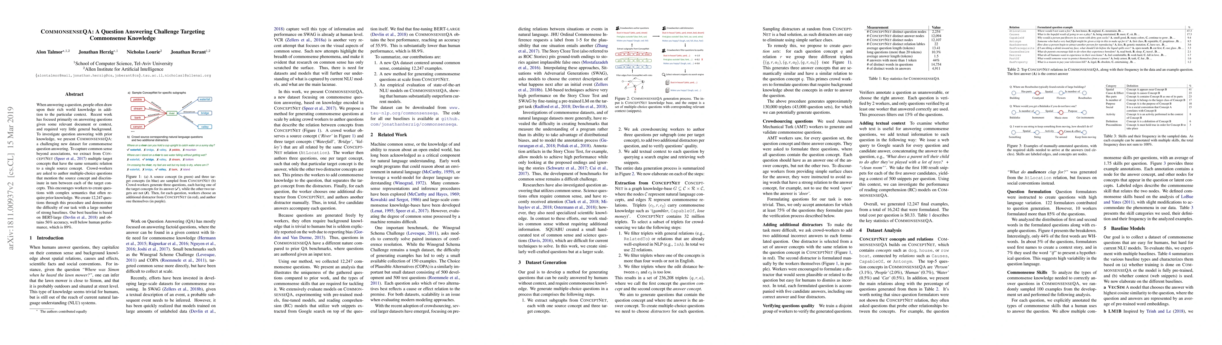 CommonsenseQA is a new dataset designed to test question answering based on commonsense knowledge rather than context-specific information. The dataset comprises 12,247 multiple-choice questions created by crowd-workers, requiring participants to discern between target concepts related by common sense to a source concept. The best-performing BERT-large model achieves 56% accuracy, significantly below human performance of 89%.