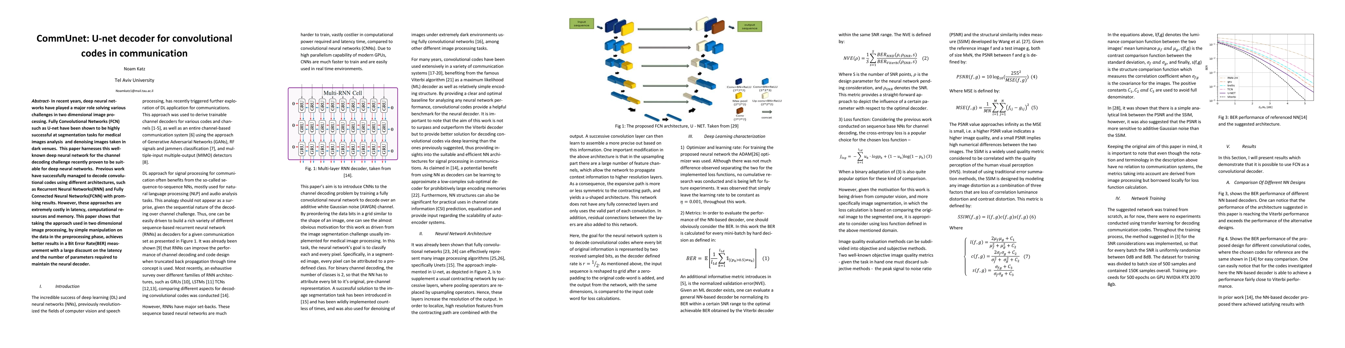 This paper proposes CommUnet, a U-net decoder for convolutional codes, leveraging the success of U-net in image processing for channel decoding. The approach significantly reduces latency and computational resources while achieving better Bit Error Rate performance compared to traditional methods like RNNs and FCNNs.