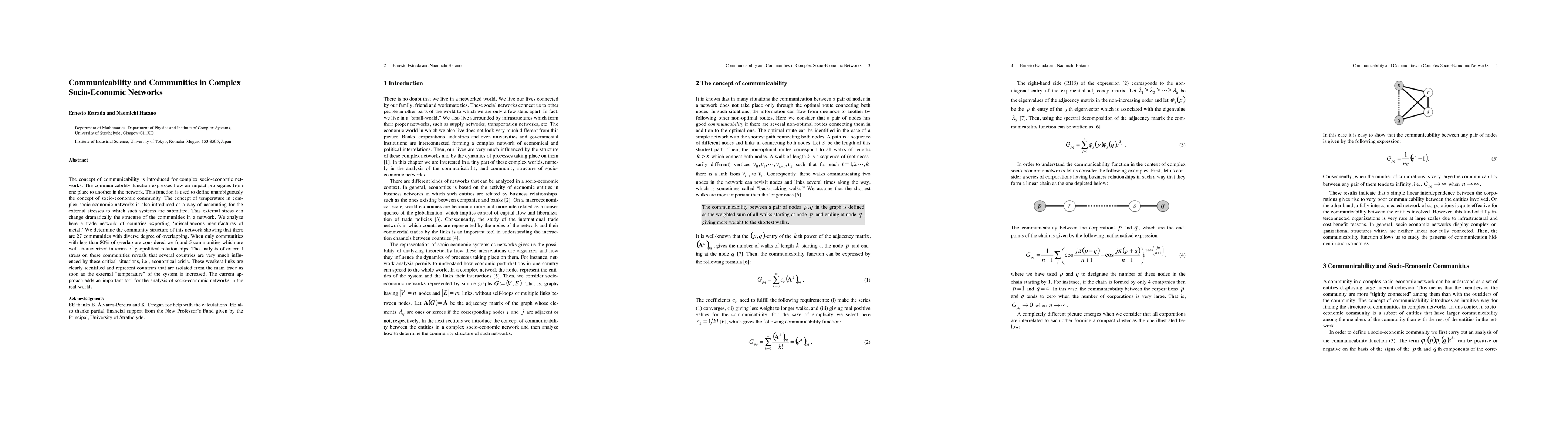 This paper introduces the concept of communicability to analyze complex socio-economic networks, defining socio-economic communities and identifying their structure under external stresses. It applies this to a trade network, revealing 27 communities, with 5 distinct ones characterized by geopolitical relationships, and identifying countries vulnerable to economic crises.