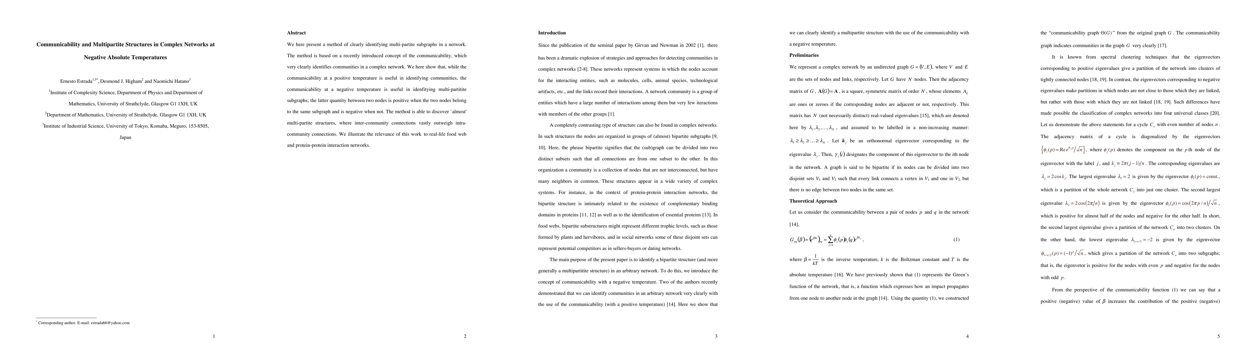 This paper introduces a method to identify multi-partite subgraphs in complex networks using communicability at negative temperatures, which distinguishes nodes within the same subgraph. The approach reveals "almost" multi-partite structures, with significant inter-community connections, and is demonstrated on real-life food web and protein-protein interaction networks.