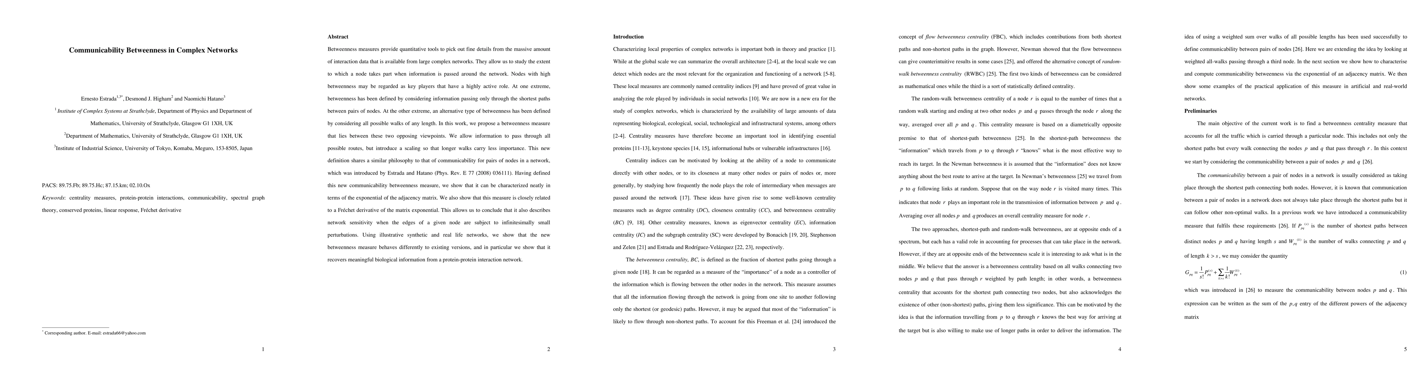 This paper introduces a novel betweenness measure that considers all possible paths in a network but scales longer paths to reflect reduced importance, akin to communicability. It characterizes this measure using the exponential of the adjacency matrix and demonstrates its applicability in revealing meaningful biological insights from protein-protein interaction networks.