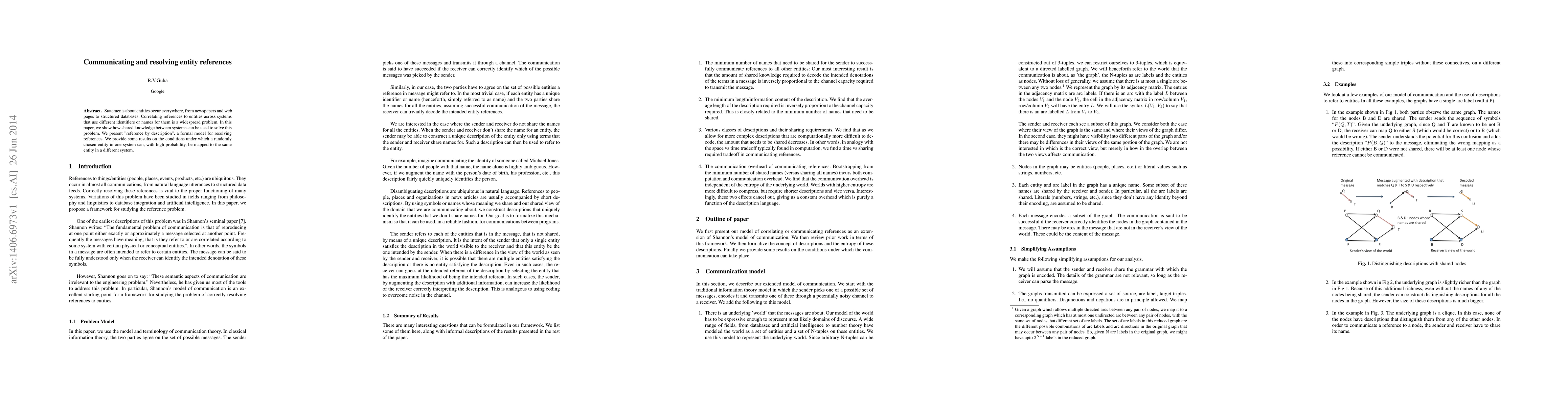 A new method called 'reference by description' is proposed to resolve entity references across different systems using shared knowledge. It offers high probability mapping of randomly chosen entities between systems.