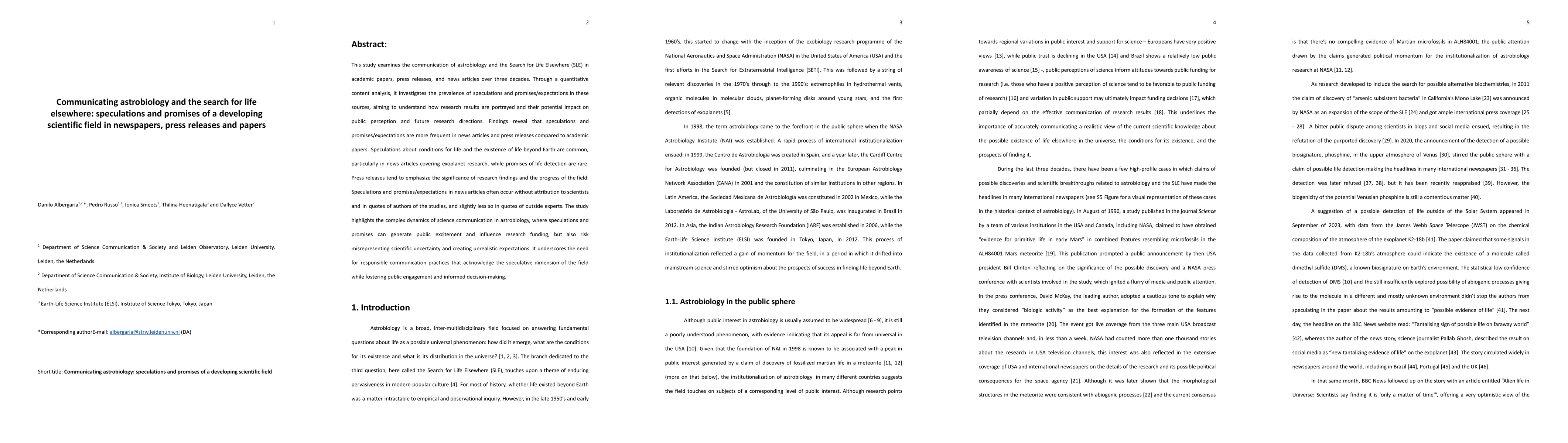 This study examines the communication of astrobiology and the Search for Life Elsewhere (SLE) in academic papers, press releases, and news articles over three decades. Through a quantitative content analysis, it investigates the prevalence of speculations and promises/expectations in these sources, aiming to understand how research results are portrayed and their potential impact on public perception and future research directions. Findings reveal that speculations and promises/expectations are more frequent in news articles and press releases compared to academic papers. Speculations about conditions for life and the existence of life beyond Earth are common, particularly in news articles covering exoplanet research, while promises of life detection are rare. Press releases tend to emphasize the significance of research findings and the progress of the field. Speculations and promises/expectations in news articles often occur without attribution to scientists and in quotes of authors of the studies, and slightly less so in quotes of outside experts. The study highlights the complex dynamics of science communication in astrobiology, where speculations and promises can generate public excitement and influence research funding, but also risk misrepresenting scientific uncertainty and creating unrealistic expectations. It underscores the need for responsible communication practices that acknowledge the speculative dimension of the field while fostering public engagement and informed decision-making.