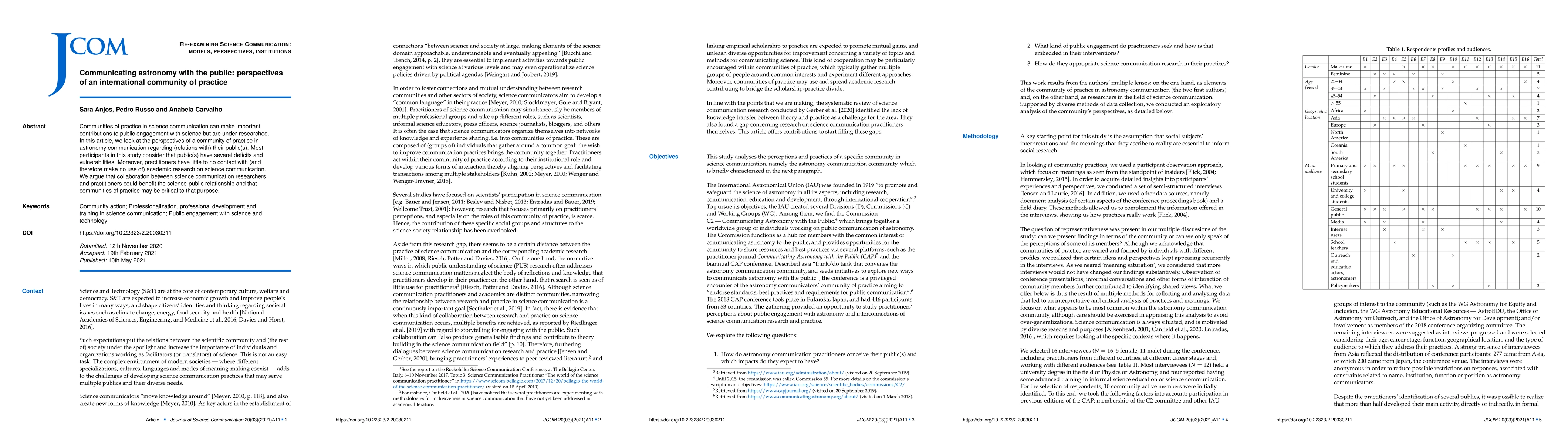 Communities of practice in science communication can make important contributions to public engagement with science but are under-researched. In this article, we look at the perspectives of a community of practice in astronomy communication regarding (relations with) their public(s). Most participants in this study consider that public(s) have several deficits and vulnerabilities. Moreover, practitioners have little to no contact with (and therefore make no use of) academic research on science communication. We argue that collaboration between science communication researchers and practitioners could benefit the science-public relationship and that communities of practice may be critical to that purpose.
