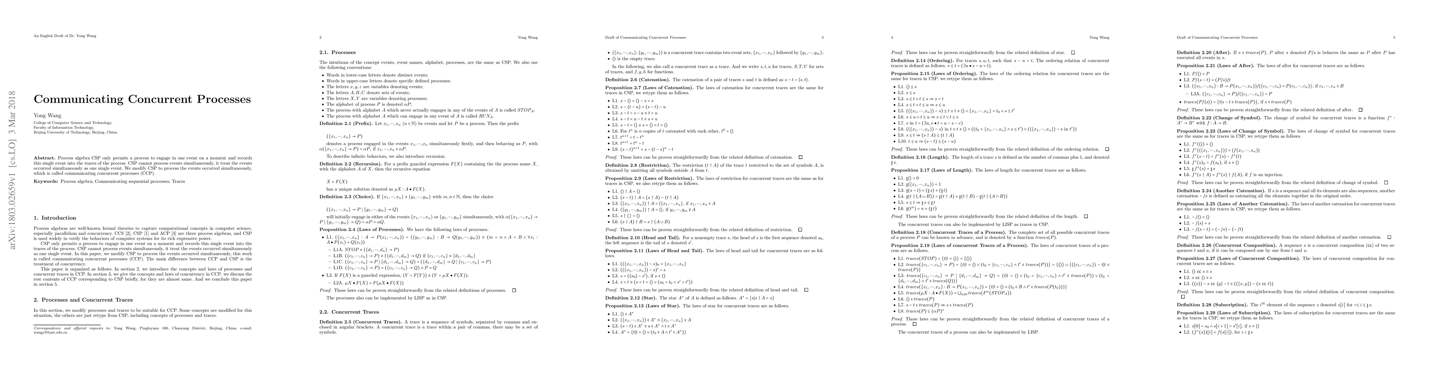 This research paper extends process algebra CSP to enable concurrent processes, allowing simultaneous events to be processed as separate actions. It provides a new model for communicating concurrent processes (CCP) with improved capabilities.