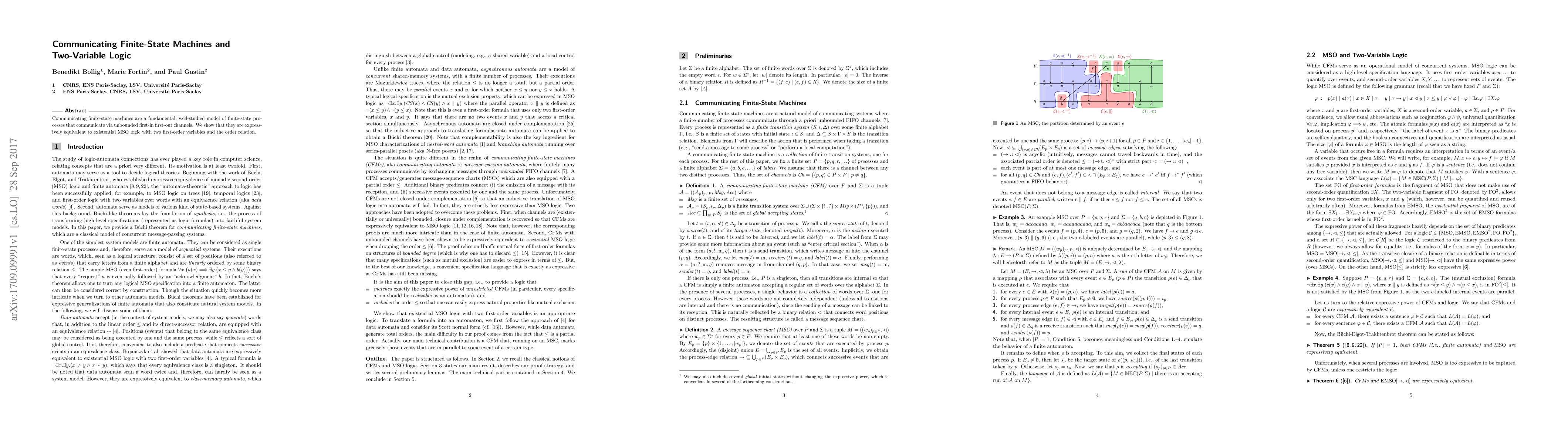 The paper establishes the expressive equivalence between communicating finite-state machines and existential monadic second-order logic (MSO) with two variables and an order relation, highlighting their comparable computational power in modeling concurrent processes.