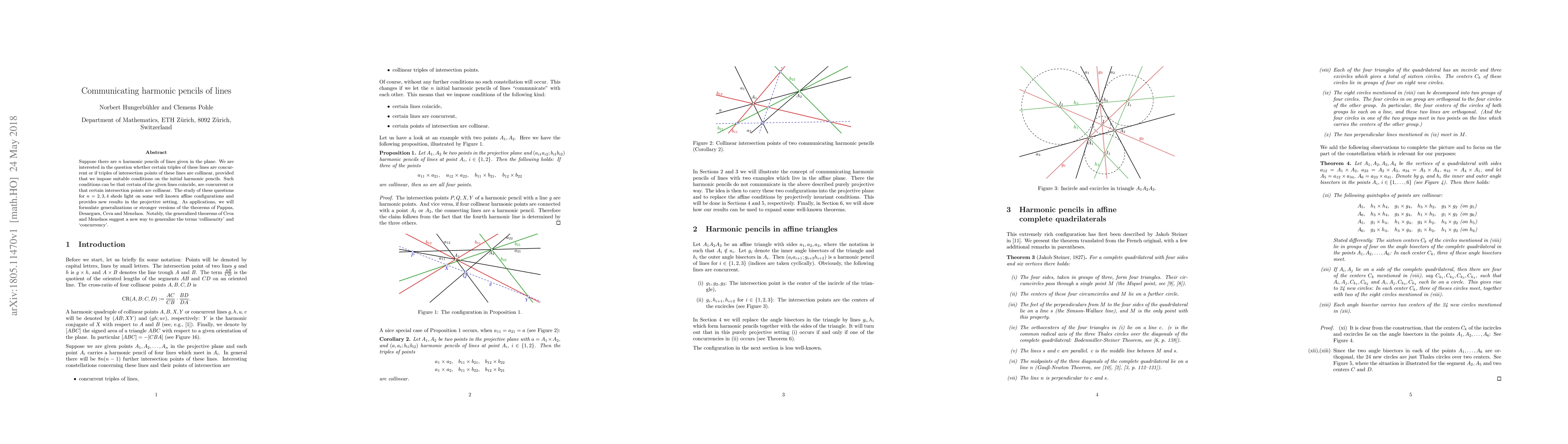 Suppose there are $n$ harmonic pencils of lines given in the plane. We are interested in the question whether certain triples of these lines are concurrent or if triples of intersection points of these lines are collinear, provided that we impose suitable conditions on the initial harmonic pencils. Such conditions can be that certain of the given lines coincide, are concurrent or that certain intersection points are collinear. The study of these questions for $n=2, 3, 4$ sheds light on some well known affine configurations and provides new results in the projective setting. As applications, we will formulate generalizations or stronger versions of the theorems of Pappus, Desargues, Ceva and Menelaos. Notably, the generalized theorems of Ceva and Menelaos suggest a new way to generalize the terms collinearity and concurrency.