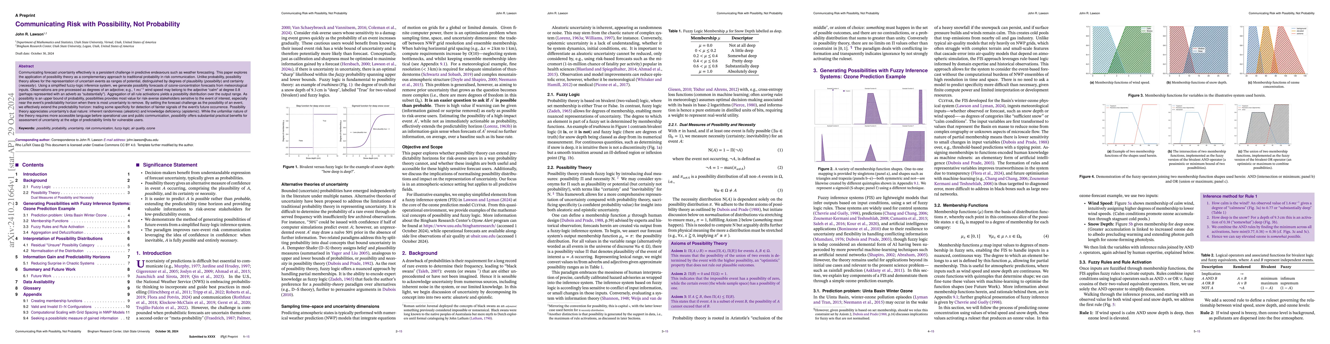 Communicating forecast uncertainty effectively is a persistent challenge in predictive endeavours such as weather forecasting. This paper explores the application of possibility theory as a complementary approach to traditional probability in risk communication. Unlike probability, possibility theory allows for the representation of uncertain events as ranges of potential, distinguished by degrees of plausibility possibility and certainty necessity. Using a simplified fuzzy-logic inference system, we generate possibility forecasts of ozone-concentration forecasts from meteorological inputs. Observations are pre-processed as degrees of an adjective, e.g., 1 m/s wind speed may belong to the adjective "calm" at degree 0.8 (perhaps represented with an adverb as "substantially"). Aggregation of all rule activations yields a possibility distribution over the output range. As possibility is an upper bound of probability, possibilities provides most value for risk-averse stakeholders sensitive to the event of interest, especially near the event's predictability horizon when there is most uncertainty to remove. By setting the forecast challenge as the possibility of an event, we effectively extend the predictability horizon: trading some specificity for detection of fainter signals of the event's future occurrence. Possibility theory appreciates uncertainty's dual nature: inherent randomness (aleatoric) and knowledge deficiency (epistemic). While the unfamiliar nature of the theory requires more accessible language before operational use and public communication, possibility offers substantial practical benefits for assessment of uncertainty at the edge of predictability limits for vulnerable users.