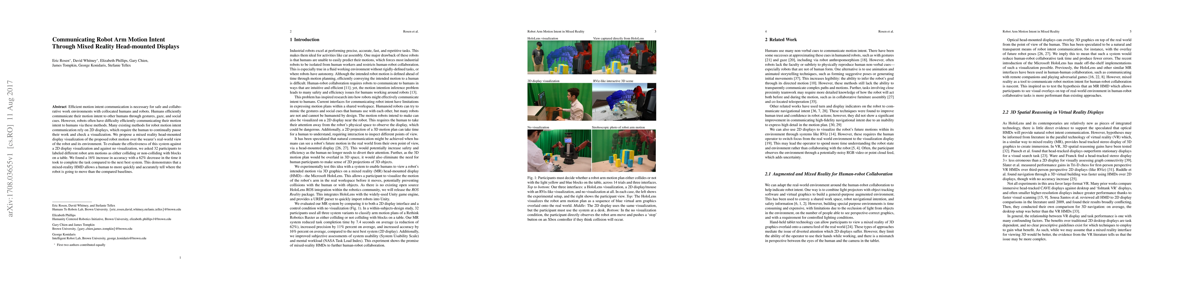 This paper proposes using mixed reality head-mounted displays to communicate robot arm motion intent, finding that it improves accuracy and reduces task completion time compared to 2D displays. Participants using the HMD system identified robot movements more effectively than those using traditional displays.
