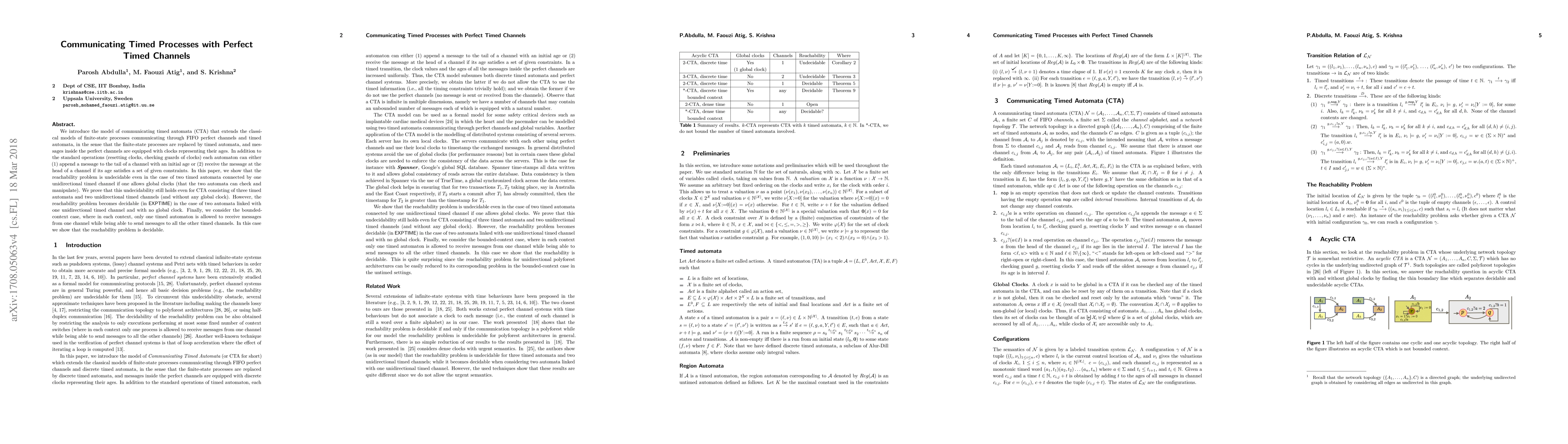 This paper introduces communicating timed automata (CTA) that extend classical models by incorporating timed automata and perfect timed channels with clocks representing message ages. It demonstrates that reachability is undecidable in certain configurations but decidable in others, notably in bounded-context scenarios.