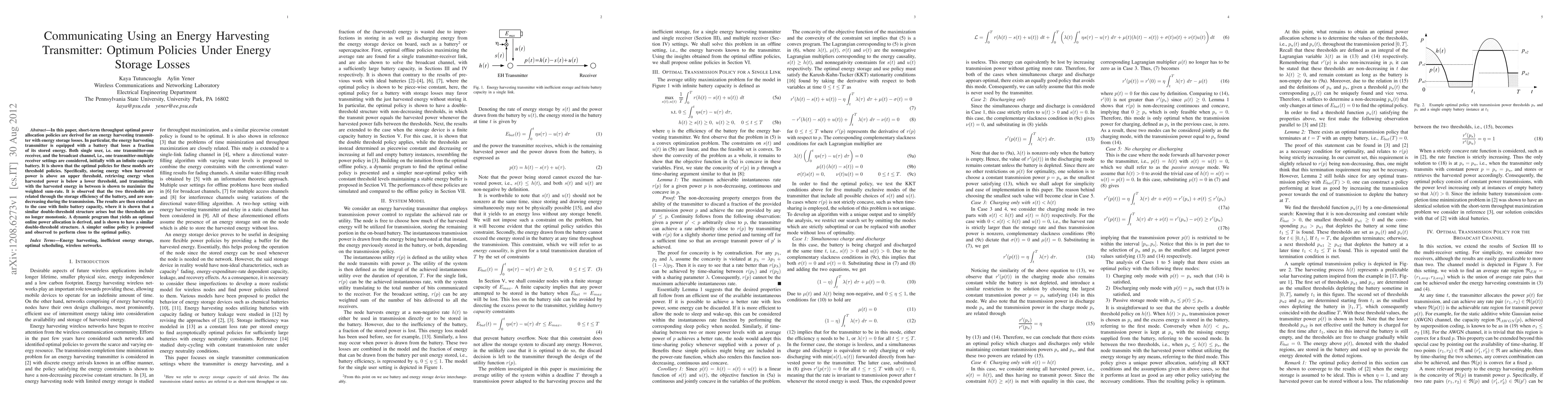This paper derives optimal power allocation policies for an energy harvesting transmitter with energy storage losses, showing that a double-threshold structure maximizes throughput. The study extends to both single-user and broadcast channel scenarios, revealing that the thresholds are influenced by the battery's storage efficiency and are nondecreasing over time.