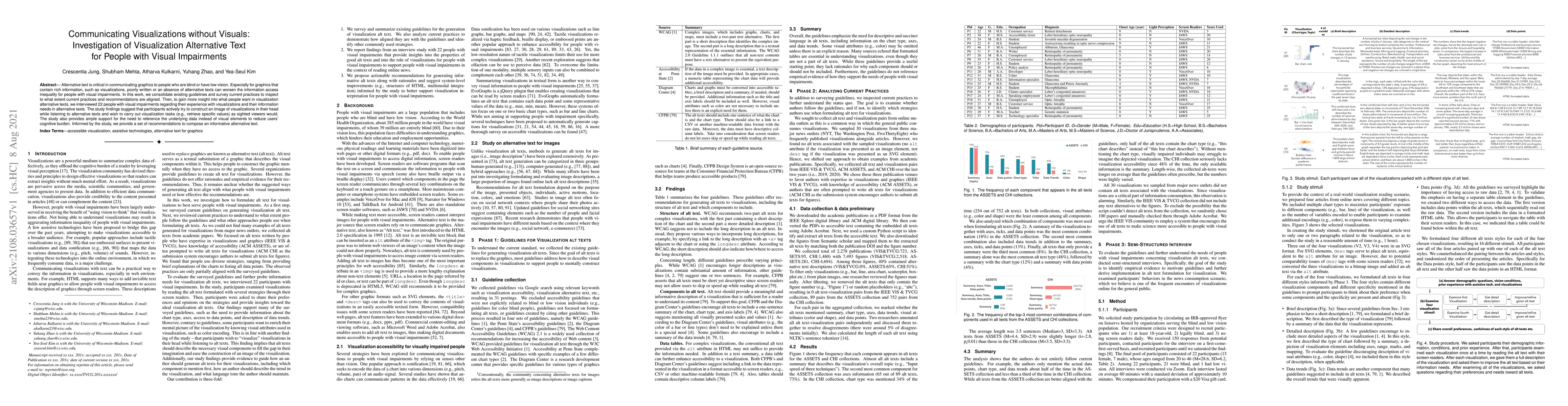 This paper investigates how to effectively communicate visualizations to people with visual impairments through alternative text. Findings from interviews with 22 visually impaired individuals highlight the need for alternative texts that reference underlying data, rather than visual elements, to reduce cognitive load and enable visualization tasks.