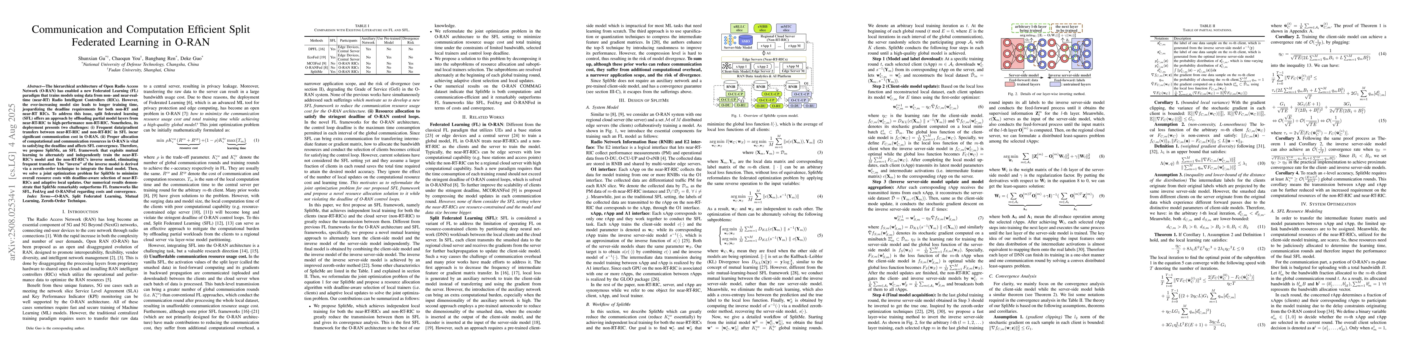 The hierarchical architecture of Open Radio Access Network (O-RAN) has enabled a new Federated Learning (FL) paradigm that trains models using data from non- and near-real-time (near-RT) Radio Intelligent Controllers (RICs). However, the ever-increasing model size leads to longer training time, jeopardizing the deadline requirements for both non-RT and near-RT RICs. To address this issue, split federated learning (SFL) offers an approach by offloading partial model layers from near-RT-RIC to high-performance non-RT-RIC. Nonetheless, its deployment presents two challenges: (i) Frequent data/gradient transfers between near-RT-RIC and non-RT-RIC in SFL incur significant communication cost in O-RAN. (ii) Proper allocation of computational and communication resources in O-RAN is vital to satisfying the deadline and affects SFL convergence. Therefore, we propose SplitMe, an SFL framework that exploits mutual learning to alternately and independently train the near-RT-RIC's model and the non-RT-RIC's inverse model, eliminating frequent transfers. The ''inverse'' of the inverse model is derived via a zeroth-order technique to integrate the final model. Then, we solve a joint optimization problem for SplitMe to minimize overall resource costs with deadline-aware selection of near-RT-RICs and adaptive local updates. Our numerical results demonstrate that SplitMe remarkably outperforms FL frameworks like SFL, FedAvg and O-RANFed regarding costs and convergence.