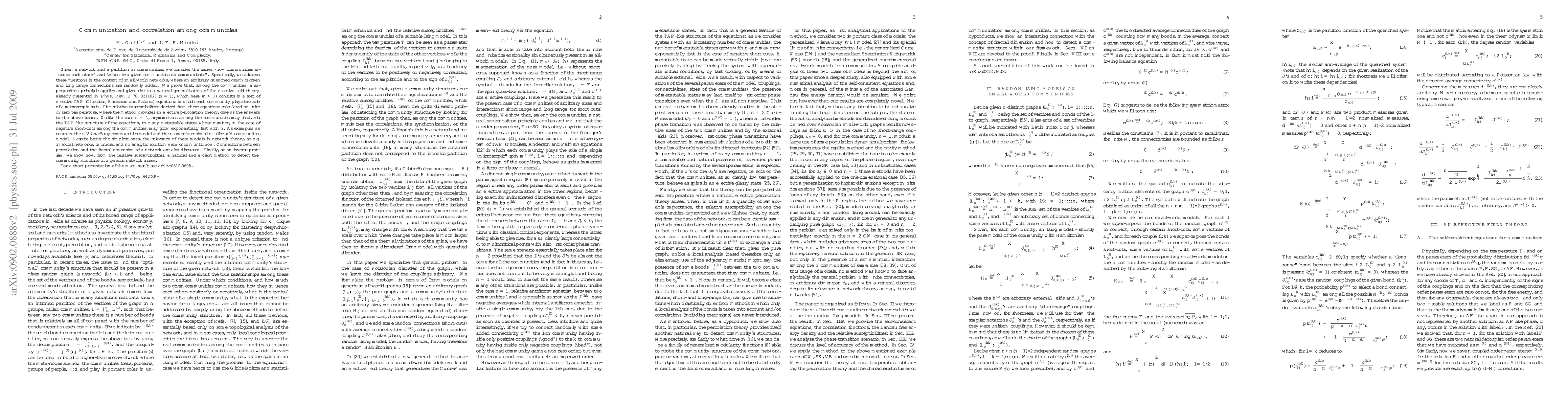 Given a network and a partition in communities, we consider the issues "how communities influence each other" and "when two given communities do communicate". Specifically, we address these questions in the context of small-world networks, where an arbitrary quenched graph is given and long range connections are randomly added. We prove that, among the communities, a superposition principle applies and gives rise to a natural generalization of the effective field theory already presented in [Phys. Rev. E 78, 031102] (n=1), which here (n>1) consists in a sort of effective TAP (Thouless, Anderson and Palmer) equations in which each community plays the role of a microscopic spin. The relative susceptibilities derived from these equations calculated at finite or zero temperature, where the method provides an effective percolation theory, give us the answers to the above issues. Unlike the case n=1, asymmetries among the communities may lead, via the TAP-like structure of the equations, to many metastable states whose number, in the case of negative short-cuts among the communities, may grow exponentially fast with n. As examples we consider the n Viana-Bray communities model and the n one-dimensional small-world communities model. Despite being the simplest ones, the relevance of these models in network theory, as e.g. in social networks, is crucial and no analytic solution were known until now. Connections between percolation and the fractal dimension of a network are also discussed. Finally, as an inverse problem, we show how, from the relative susceptibilities, a natural and efficient method to detect the community structure of a generic network arises. For a short presentation of the main result see arXiv:0812.0608.