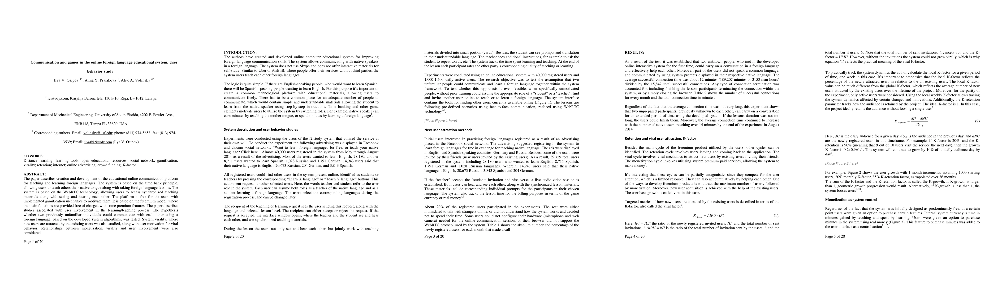 The paper explores an online platform for foreign language learning using WebRTC technology, focusing on user involvement and gamification. Studies tested communication efficacy between unfamiliar users and the impact of virality and monetization on user engagement.