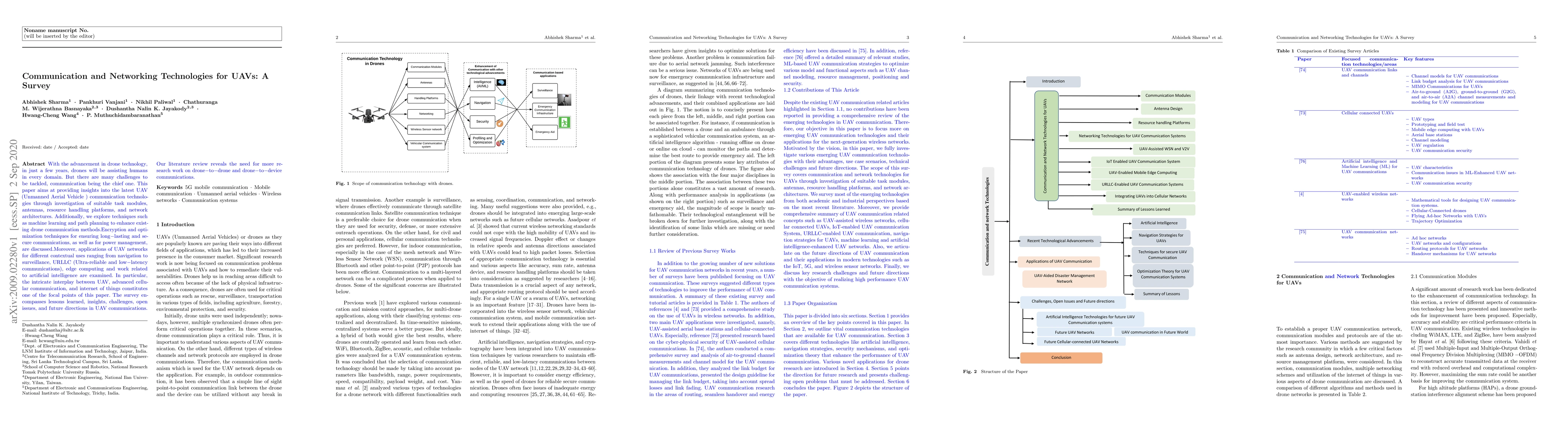 With the advancement in drone technology, in just a few years, drones will be assisting humans in every domain. But there are many challenges to be tackled, communication being the chief one. This paper aims at providing insights into the latest UAV (Unmanned Aerial Vehicle) communication technologies through investigation of suitable task modules, antennas, resource handling platforms, and network architectures. Additionally, we explore techniques such as machine learning and path planning to enhance existing drone communication methods. Encryption and optimization techniques for ensuring long lasting and secure communications, as well as for power management, are discussed. Moreover, applications of UAV networks for different contextual uses ranging from navigation to surveillance, URLLC (Ultra reliable and low latency communications), edge computing and work related to artificial intelligence are examined. In particular, the intricate interplay between UAV, advanced cellular communication, and internet of things constitutes one of the focal points of this paper. The survey encompasses lessons learned, insights, challenges, open issues, and future directions in UAV communications. Our literature review reveals the need for more research work on drone to drone and drone to device communications.