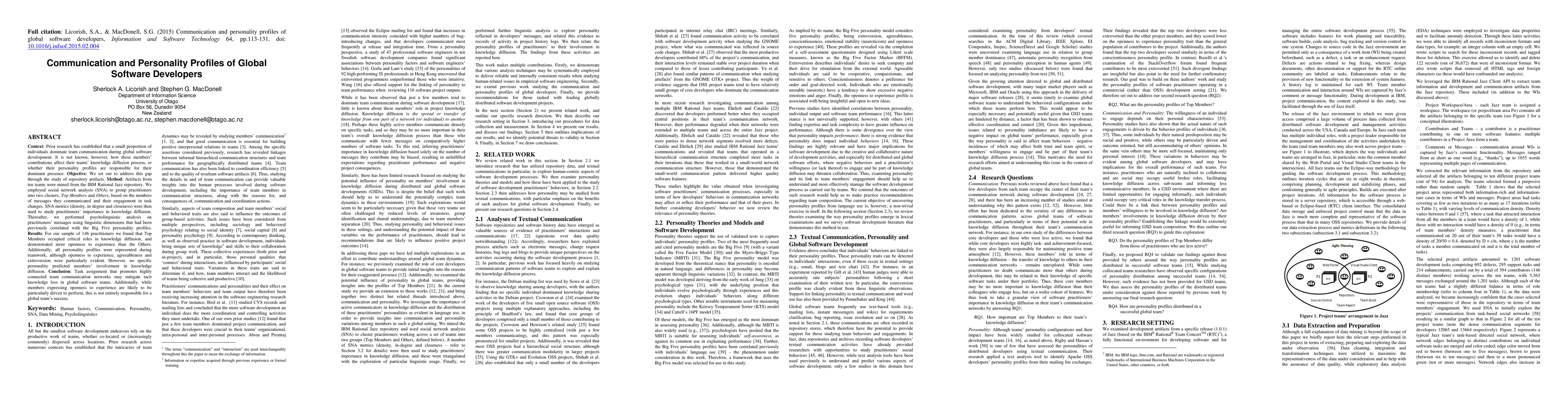This study explores the communication and personality profiles of global software developers, finding that top communicators play crucial roles in knowledge diffusion and exhibit higher levels of openness to experience. Despite varied personality profiles among team members, no specific personality trait directly predicts involvement in knowledge diffusion.
