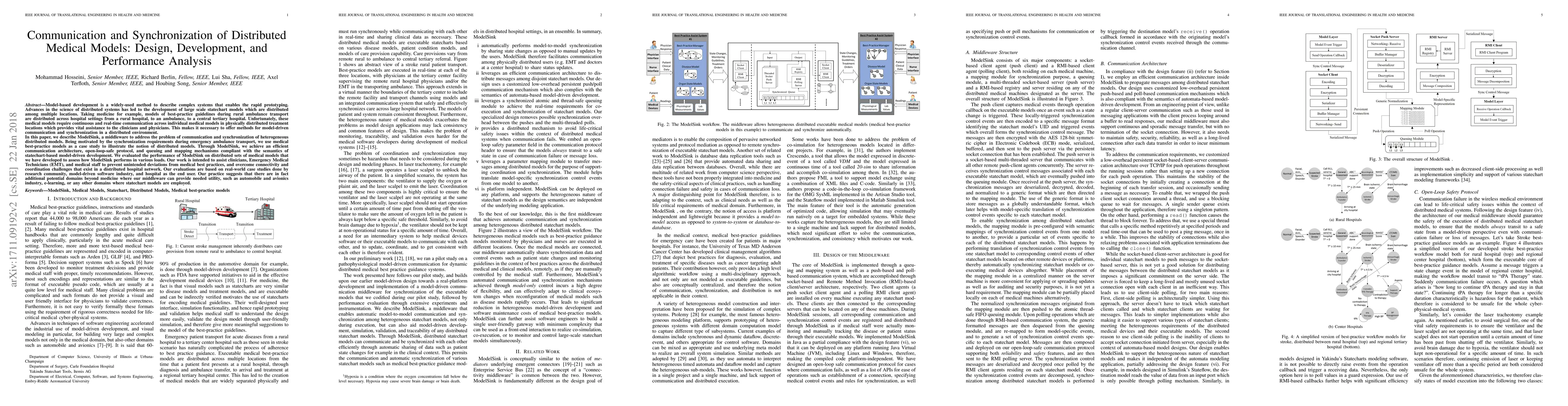 Model-based development is a widely-used method to describe complex systems that enables the rapid prototyping. Advances in the science of distributed systems has led to the development of large scale statechart models which are distributed among multiple locations. Taking medicine for example, models of best-practice guidelines during rural ambulance transport are distributed across hospital settings from a rural hospital, to an ambulance, to a central tertiary hospital. Unfortunately, these medical models require continuous and real-time communication across individual medical models in physically distributed treatment locations which provides vital assistance to the clinicians and physicians. This makes it necessary to offer methods for model-driven communication and synchronization in a distributed environment. In this paper, we describe ModelSink, a middleware to address the problem of communication and synchronization of heterogeneous distributed models. Being motivated by the synchronization requirements during emergency ambulance transport, we use medical best-practice models as a case study to illustrate the notion of distributed models. Through ModelSink, we achieve an efficient communication architecture, open-loop-safe protocol, and queuing and mapping mechanisms compliant with the semantics of statechart-based model-driven development. We evaluated the performance of ModelSink on distributed sets of medical models that we have developed to assess how ModelSink performs in various loads. Our work is intended to assist clinicians, EMT, and medical staff to prevent unintended deviations from medical best practices, and overcome connectivity and coordination challenges that exist in a distributed hospital network. Our practice suggests that there are in fact additional potential domains beyond medicine where our middleware can provide needed utility.