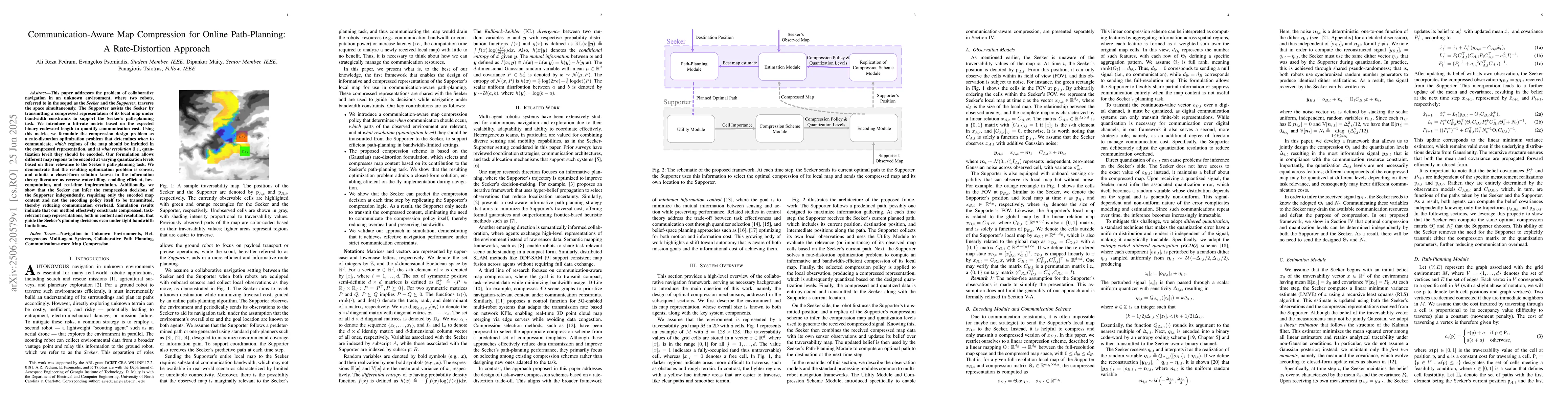 This paper addresses the problem of collaborative navigation in an unknown environment, where two robots, referred to in the sequel as the Seeker and the Supporter, traverse the space simultaneously. The Supporter assists the Seeker by transmitting a compressed representation of its local map under bandwidth constraints to support the Seeker's path-planning task. We introduce a bit-rate metric based on the expected binary codeword length to quantify communication cost. Using this metric, we formulate the compression design problem as a rate-distortion optimization problem that determines when to communicate, which regions of the map should be included in the compressed representation, and at what resolution (i.e., quantization level) they should be encoded. Our formulation allows different map regions to be encoded at varying quantization levels based on their relevance to the Seeker's path-planning task. We demonstrate that the resulting optimization problem is convex, and admits a closed-form solution known in the information theory literature as reverse water-filling, enabling efficient, low-computation, and real-time implementation. Additionally, we show that the Seeker can infer the compression decisions of the Supporter independently, requiring only the encoded map content and not the encoding policy itself to be transmitted, thereby reducing communication overhead. Simulation results indicate that our method effectively constructs compressed, task-relevant map representations, both in content and resolution, that guide the Seeker's planning decisions even under tight bandwidth limitations.