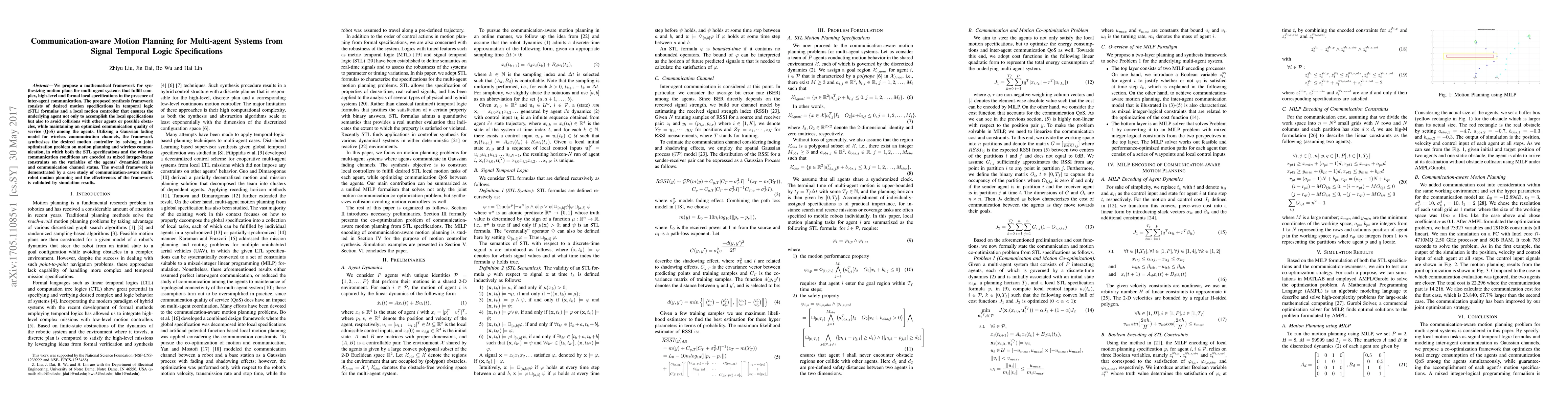 This paper proposes a mathematical framework for synthesizing motion plans for multi-agent systems that meet complex local specifications defined in signal temporal logic, while optimizing communication quality and avoiding collisions. The framework integrates motion planning and wireless communication constraints into a joint optimization problem, demonstrated through a multi-robot motion planning case study.