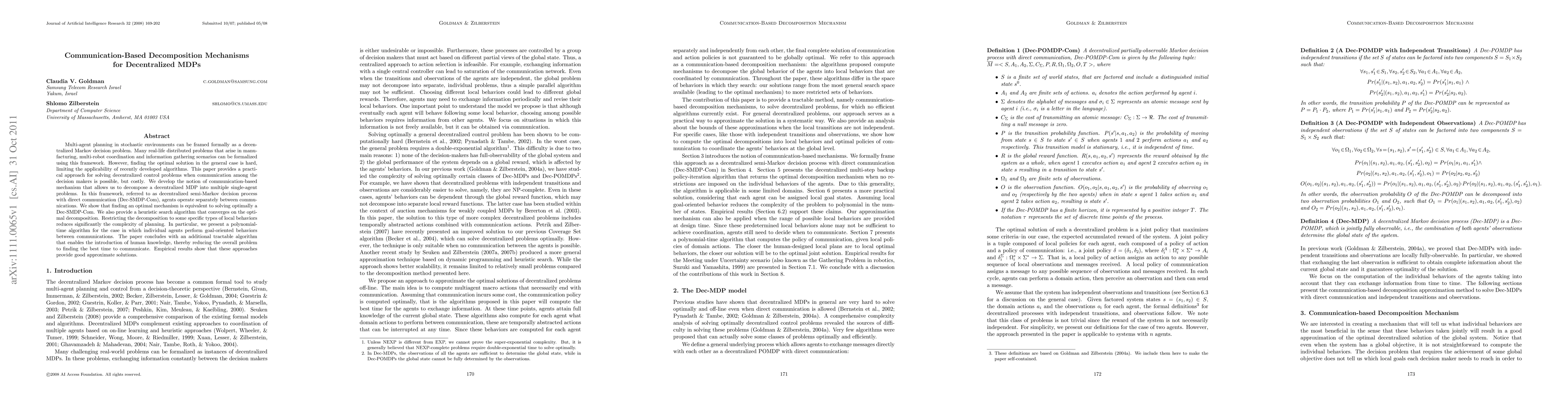 Multi-agent planning in stochastic environments can be framed formally as a decentralized Markov decision problem. Many real-life distributed problems that arise in manufacturing, multi-robot coordination and information gathering scenarios can be formalized using this framework. However, finding the optimal solution in the general case is hard, limiting the applicability of recently developed algorithms. This paper provides a practical approach for solving decentralized control problems when communication among the decision makers is possible, but costly. We develop the notion of communication-based mechanism that allows us to decompose a decentralized MDP into multiple single-agent problems. In this framework, referred to as decentralized semi-Markov decision process with direct communication (Dec-SMDP-Com), agents operate separately between communications. We show that finding an optimal mechanism is equivalent to solving optimally a Dec-SMDP-Com. We also provide a heuristic search algorithm that converges on the optimal decomposition. Restricting the decomposition to some specific types of local behaviors reduces significantly the complexity of planning. In particular, we present a polynomial-time algorithm for the case in which individual agents perform goal-oriented behaviors between communications. The paper concludes with an additional tractable algorithm that enables the introduction of human knowledge, thereby reducing the overall problem to finding the best time to communicate. Empirical results show that these approaches provide good approximate solutions.