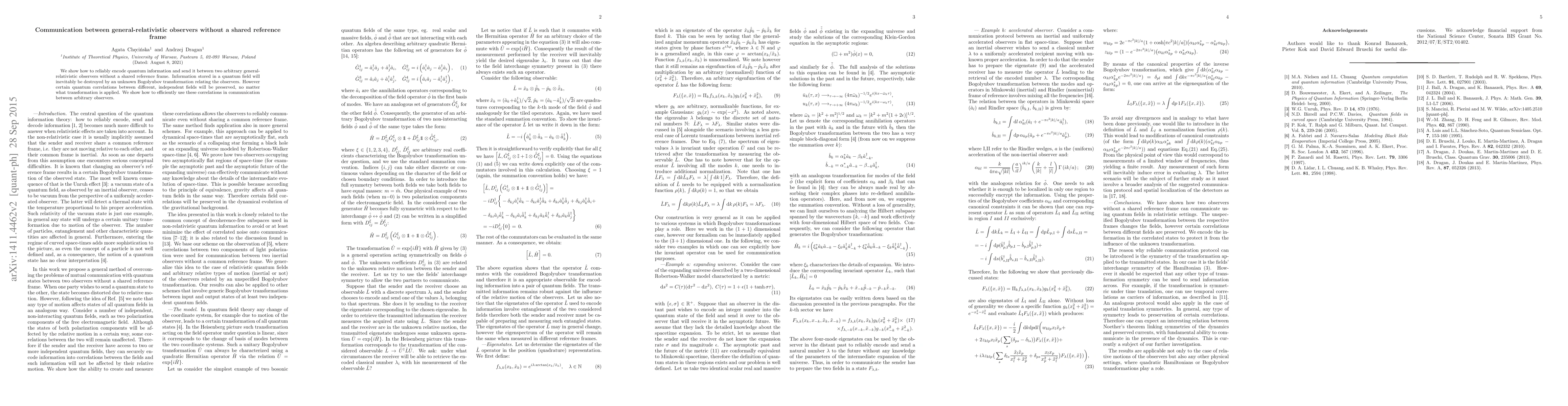 This paper presents a method for encoding and transmitting quantum information between general-relativistic observers without a shared reference frame, leveraging preserved quantum correlations between independent fields to ensure reliable communication despite Bogolyubov transformations.