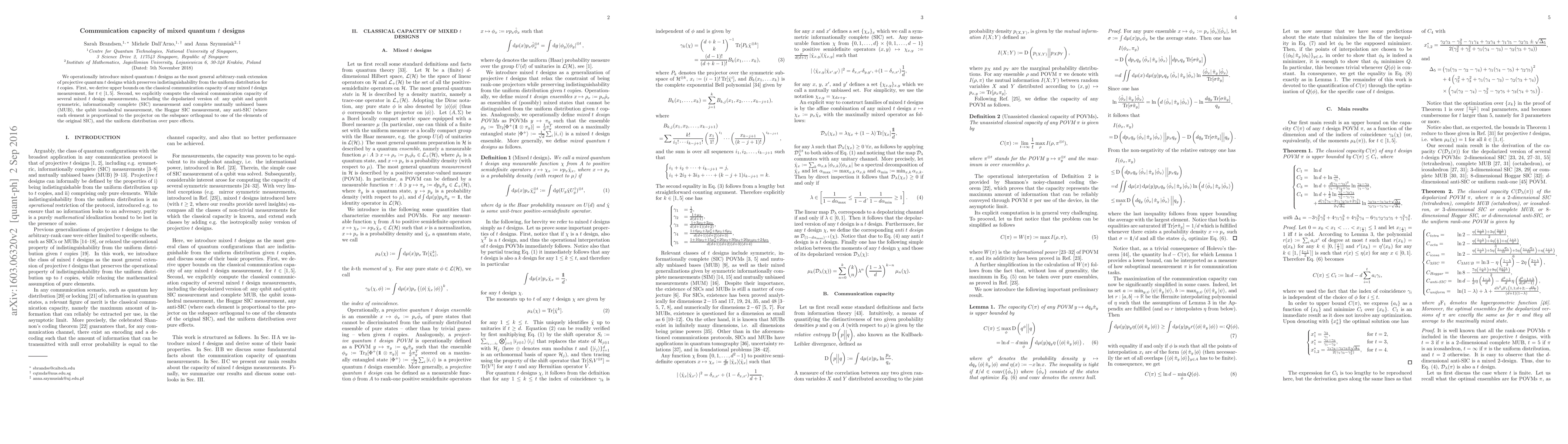 We operationally introduce mixed quantum t-designs as the most general arbitrary-rank extension of projective quantum t-designs which preserves indistinguishability from the uniform distribution for t copies. First, we derive upper bounds on the classical communication capacity of any mixed t-design measurement for t in [1,5]. Second, we explicitly compute the classical communication capacity of several mixed t-design measurements, including the depolarized version of any qubit and qutrit symmetric, informationally complete (SIC) measurement and complete mutually unbiased bases, the qubit icosahedral measurement, the Hoggar SIC measurement, any anti-SIC (where each element is proportional to the projector on the subspace orthogonal to one of the elements of the original SIC), and the uniform distribution over pure effects.