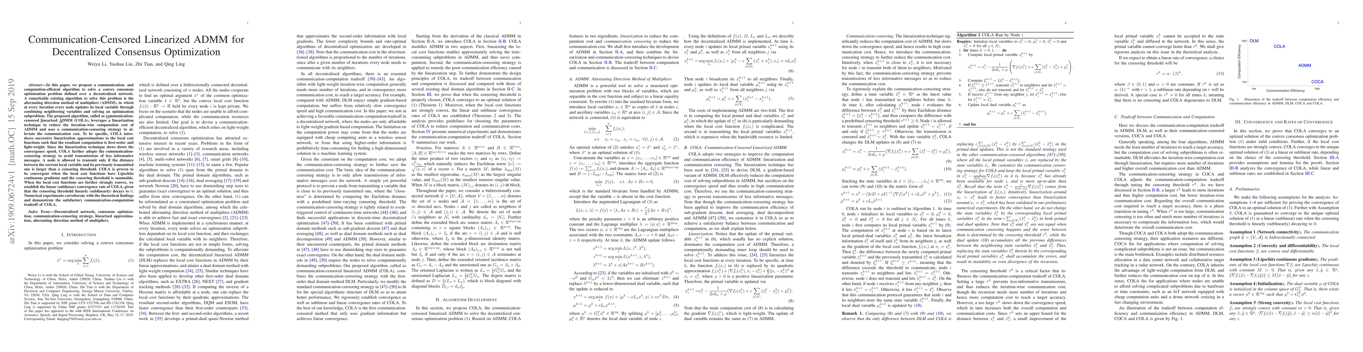 This paper introduces the COmmunication-censored Linearized ADMM (COLA) algorithm to solve decentralized consensus optimization problems efficiently. COLA employs linearization to reduce computation costs and a communication-censoring strategy to minimize communication overhead, achieving a favorable trade-off between communication and computation. Theoretical convergence and convergence rates are established under certain conditions, validated by numerical experiments.