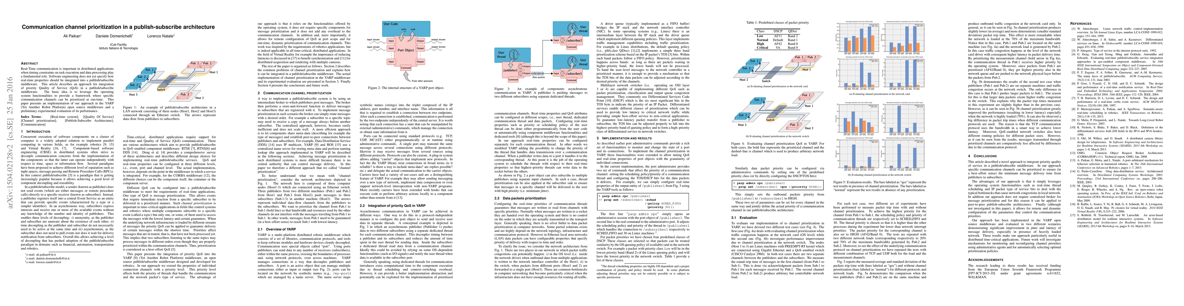 This paper proposes an approach to integrate priority quality of service into a publish/subscribe middleware by leveraging operating system functionalities to prioritize communication channels. The method is implemented in the YARP framework, and performance tests demonstrate its effectiveness.