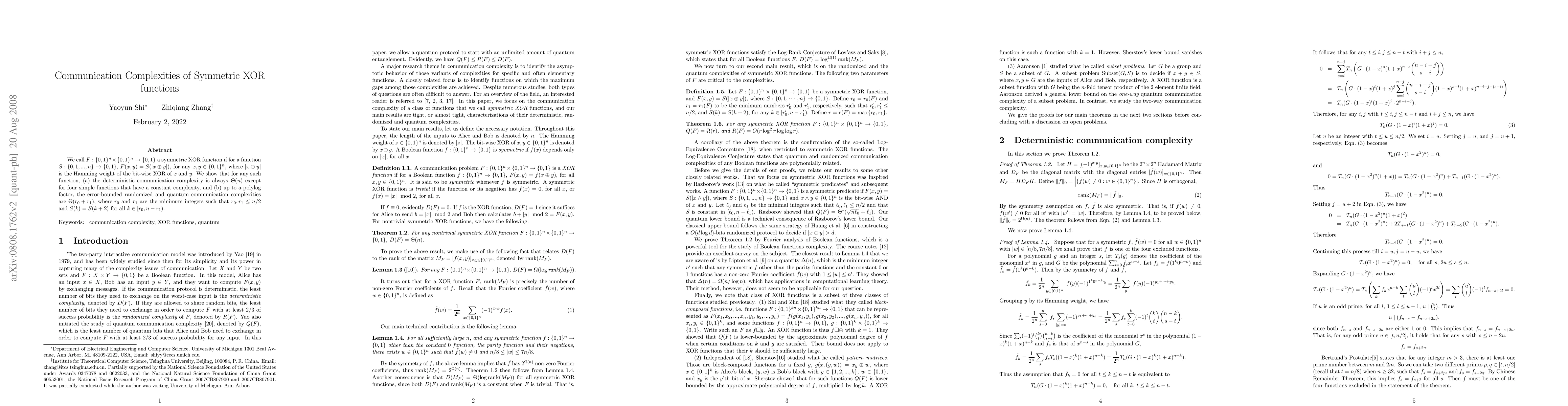 This paper investigates the communication complexities of symmetric XOR functions, demonstrating that their deterministic complexity is $\Theta(n)$ except for four simple functions with constant complexity. It also shows that the randomized and quantum complexities are $\Theta(r_0+r_1)$ up to a polylog factor.