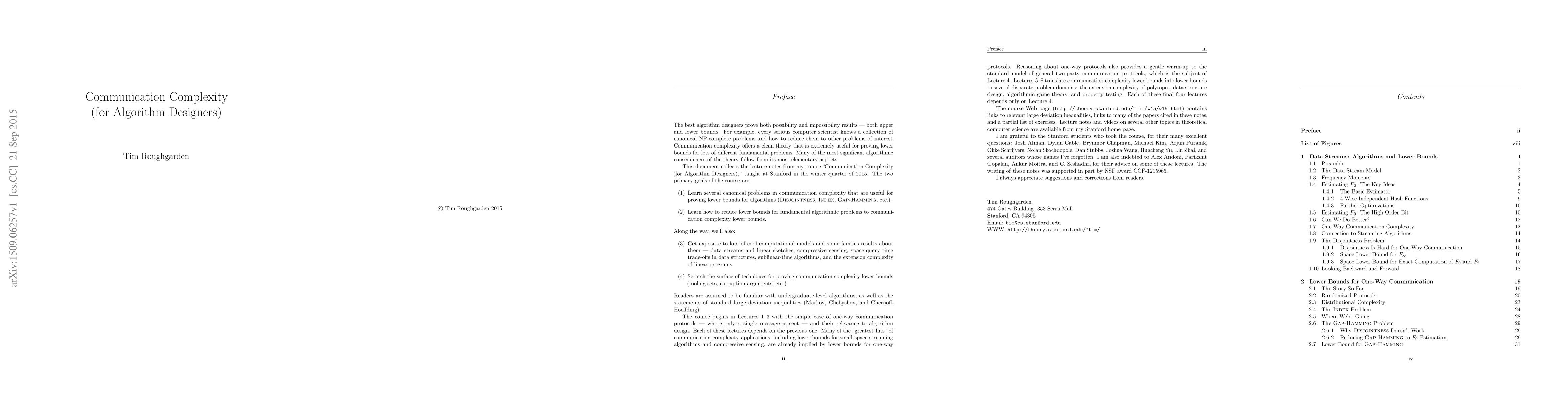 This document collects the lecture notes from my course "Communication Complexity (for Algorithm Designers),'' taught at Stanford in the winter quarter of 2015. The two primary goals of the course are: 1. Learn several canonical problems that have proved the most useful for proving lower bounds (Disjointness, Index, Gap-Hamming, etc.). 2. Learn how to reduce lower bounds for fundamental algorithmic problems to communication complexity lower bounds. Along the way, we'll also: 3. Get exposure to lots of cool computational models and some famous results about them --- data streams and linear sketches, compressive sensing, space-query time trade-offs in data structures, sublinear-time algorithms, and the extension complexity of linear programs. 4. Scratch the surface of techniques for proving communication complexity lower bounds (fooling sets, corruption bounds, etc.).