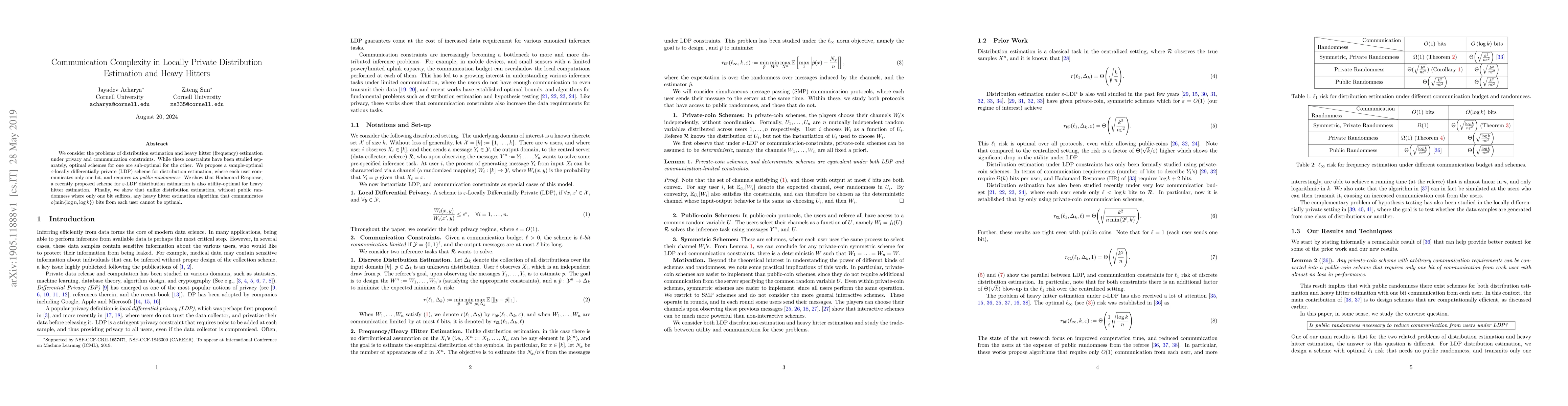 We consider the problems of distribution estimation and heavy hitter (frequency) estimation under privacy and communication constraints. While these constraints have been studied separately, optimal schemes for one are sub-optimal for the other. We propose a sample-optimal $\varepsilon$-locally differentially private (LDP) scheme for distribution estimation, where each user communicates only one bit, and requires no public randomness. We show that Hadamard Response, a recently proposed scheme for $\varepsilon$-LDP distribution estimation is also utility-optimal for heavy hitter estimation. Finally, we show that unlike distribution estimation, without public randomness where only one bit suffices, any heavy hitter estimation algorithm that communicates $o(\min \{\log n, \log k\})$ bits from each user cannot be optimal.