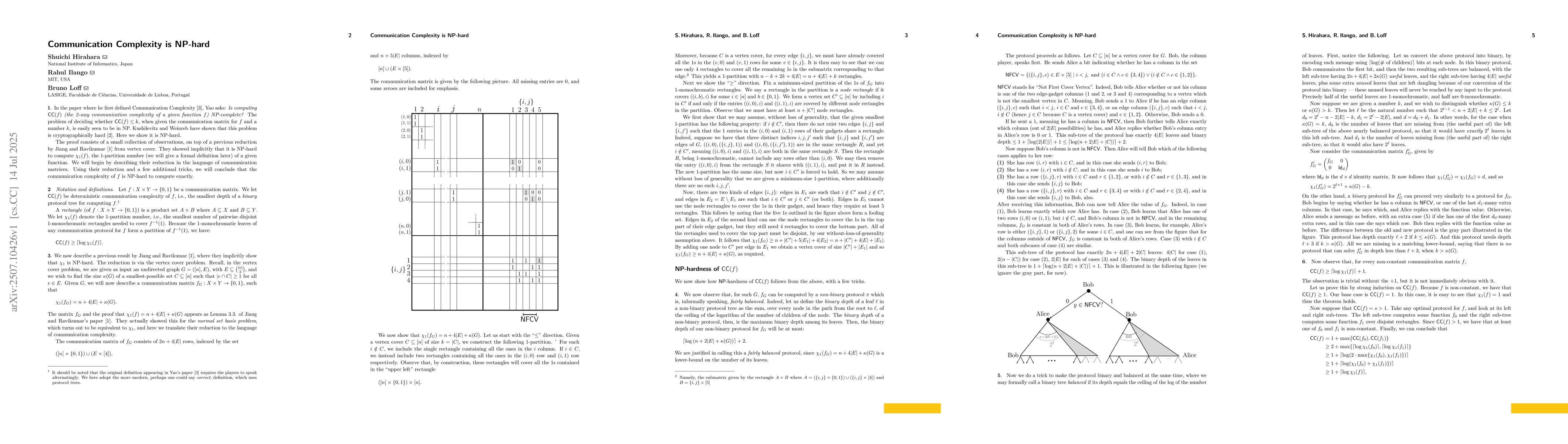 In the paper where he first defined Communication Complexity, Yao asks: \emph{Is computing $CC(f)$ (the 2-way communication complexity of a given function $f$) NP-complete?} The problem of deciding whether $CC(f) \le k$, when given the communication matrix for $f$ and a number $k$, is easily seen to be in NP. Kushilevitz and Weinreb have shown that this problem is cryptographically hard. Here we show it is NP-hard.