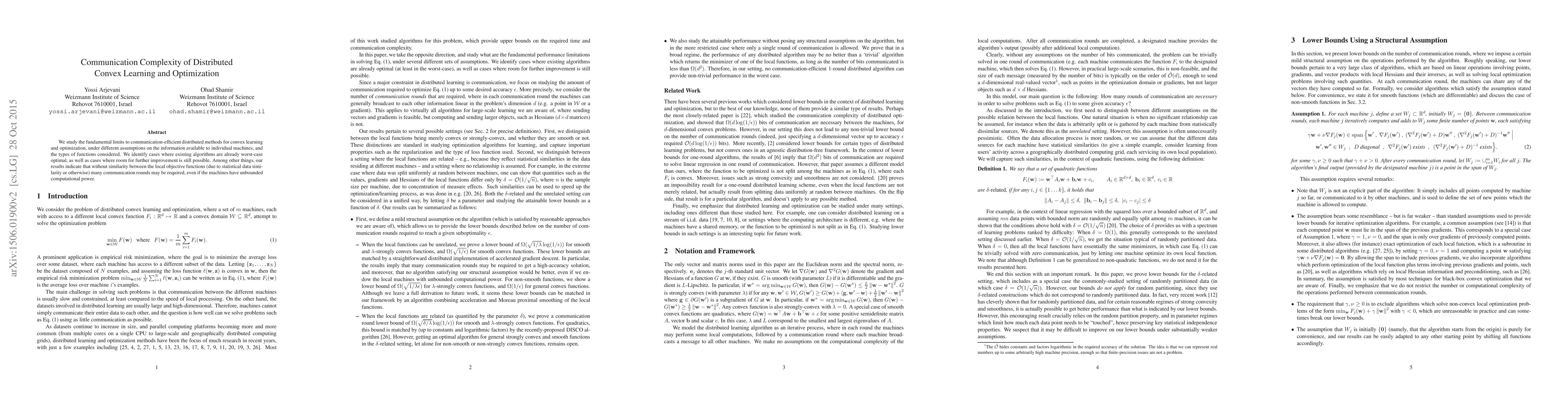 We study the fundamental limits to communication-efficient distributed methods for convex learning and optimization, under different assumptions on the information available to individual machines, and the types of functions considered. We identify cases where existing algorithms are already worst-case optimal, as well as cases where room for further improvement is still possible. Among other things, our results indicate that without similarity between the local objective functions (due to statistical data similarity or otherwise) many communication rounds may be required, even if the machines have unbounded computational power.