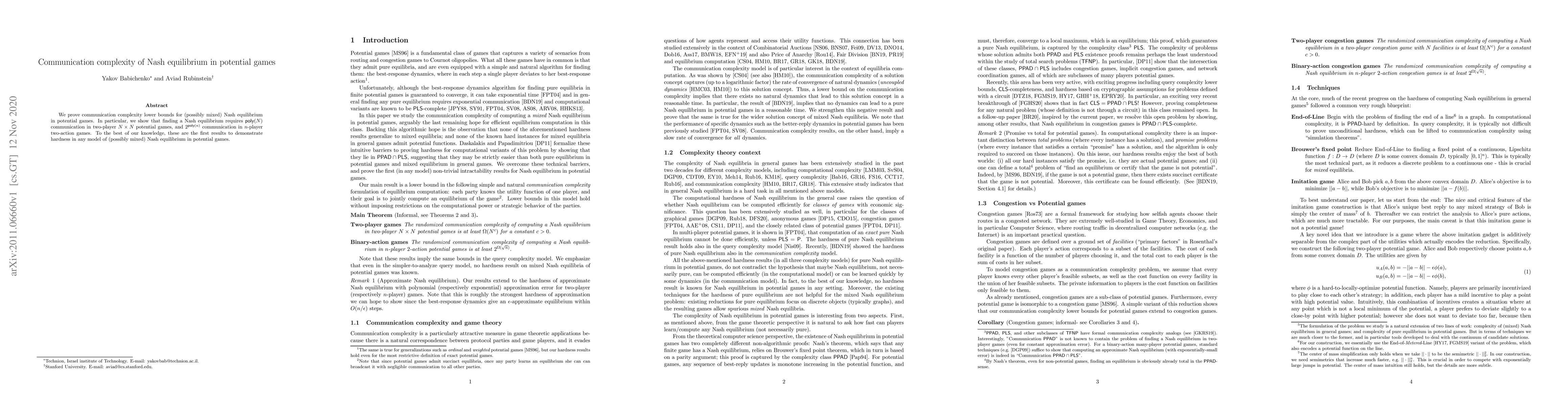 We prove communication complexity lower bounds for (possibly mixed) Nash equilibrium in potential games. In particular, we show that finding a Nash equilibrium requires $poly(N)$ communication in two-player $N \times N$ potential games, and $2^{poly(n)}$ communication in $n$-player two-action games. To the best of our knowledge, these are the first results to demonstrate hardness in any model of (possibly mixed) Nash equilibrium in potential games.