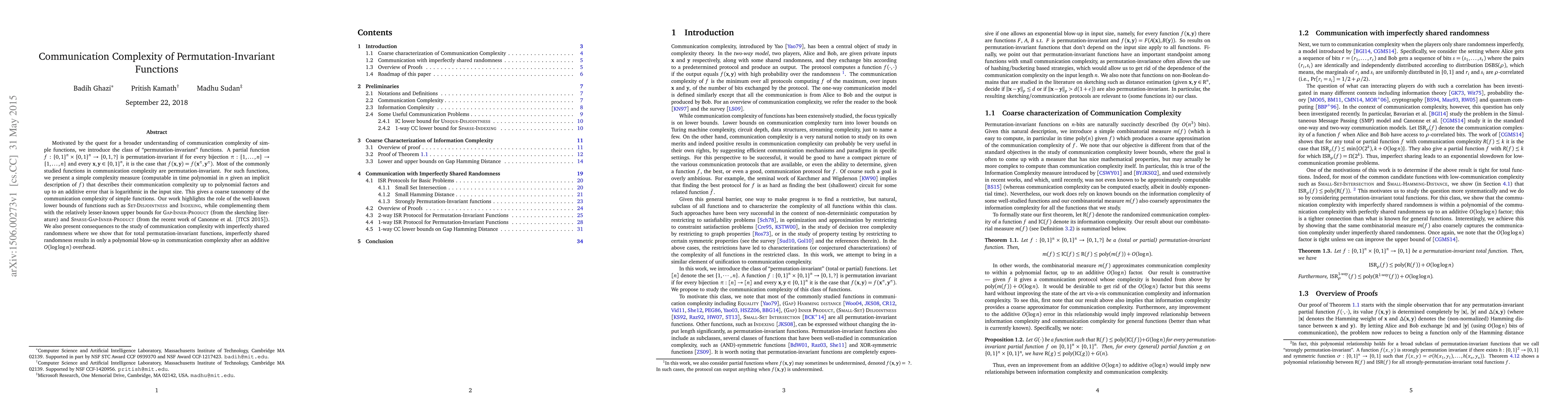 This paper explores the communication complexity of permutation-invariant functions, introducing a new complexity measure that characterizes their complexity up to polynomial factors and logarithmic additive error. It highlights the interplay between well-known lower bounds and lesser-known upper bounds, and discusses implications for communication complexity with imperfectly shared randomness.