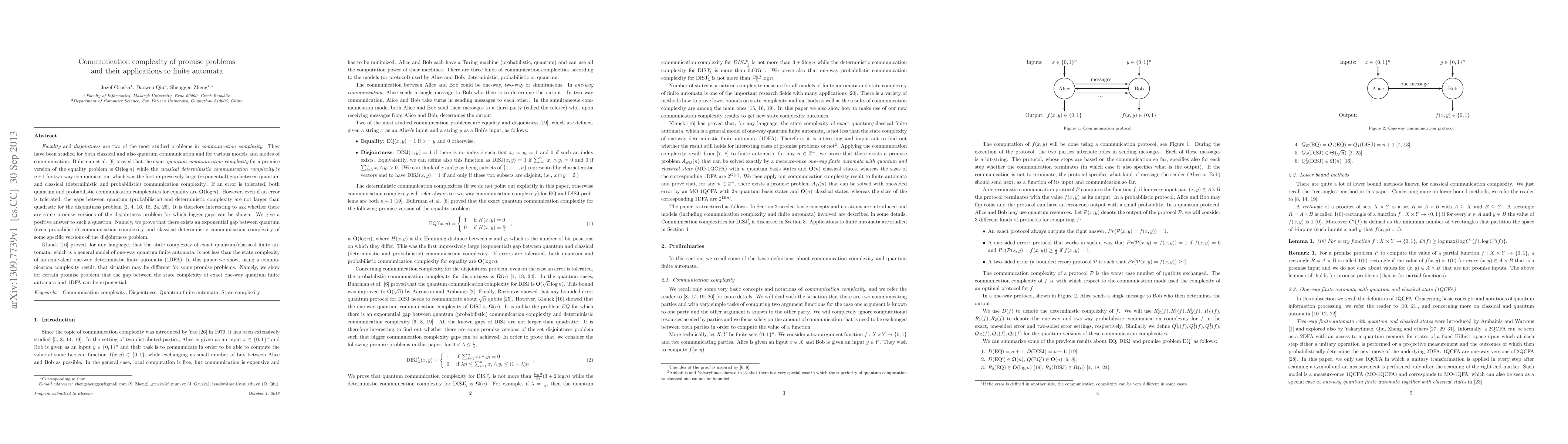 This paper investigates the communication complexity of promise versions of equality and disjointness problems, revealing an exponential gap between quantum (probabilistic) and classical deterministic communication complexities for specific disjointness promise problems. It also demonstrates that for certain promise problems, the state complexity of exact one-way quantum finite automata can be exponentially larger than that of equivalent deterministic finite automata.