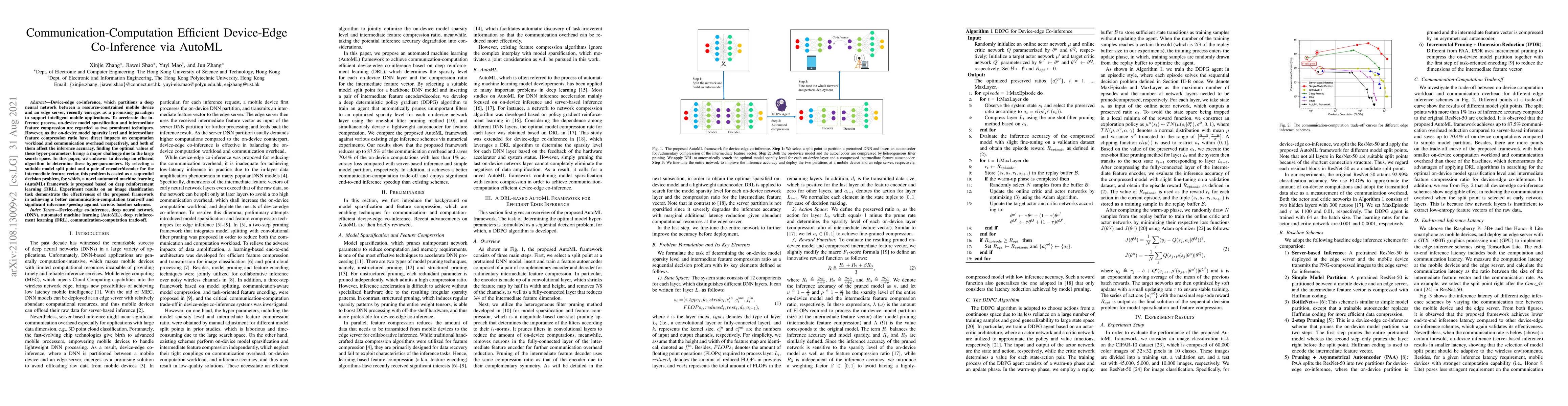 This paper proposes an AutoML framework based on deep reinforcement learning to optimize hyperparameters for device-edge co-inference, achieving a better communication-computation trade-off and significant inference speedup in an image classification task. The framework determines the optimal model sparsity and intermediate feature compression to balance accuracy and efficiency.