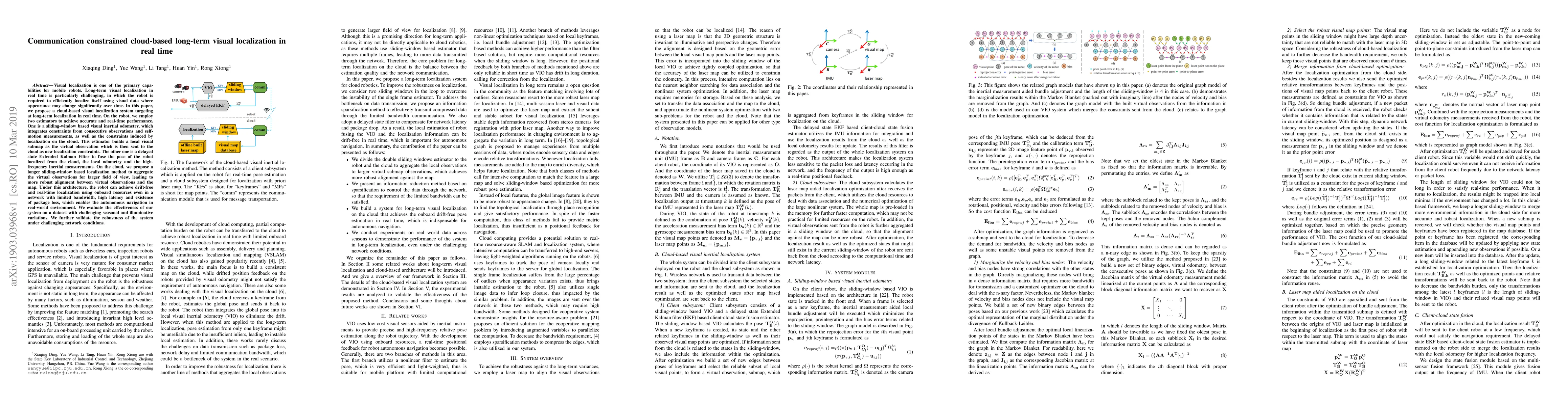 This paper proposes a cloud-based visual localization system for long-term real-time localization in changing environments, achieving drift-free performance even with limited network bandwidth and latency.