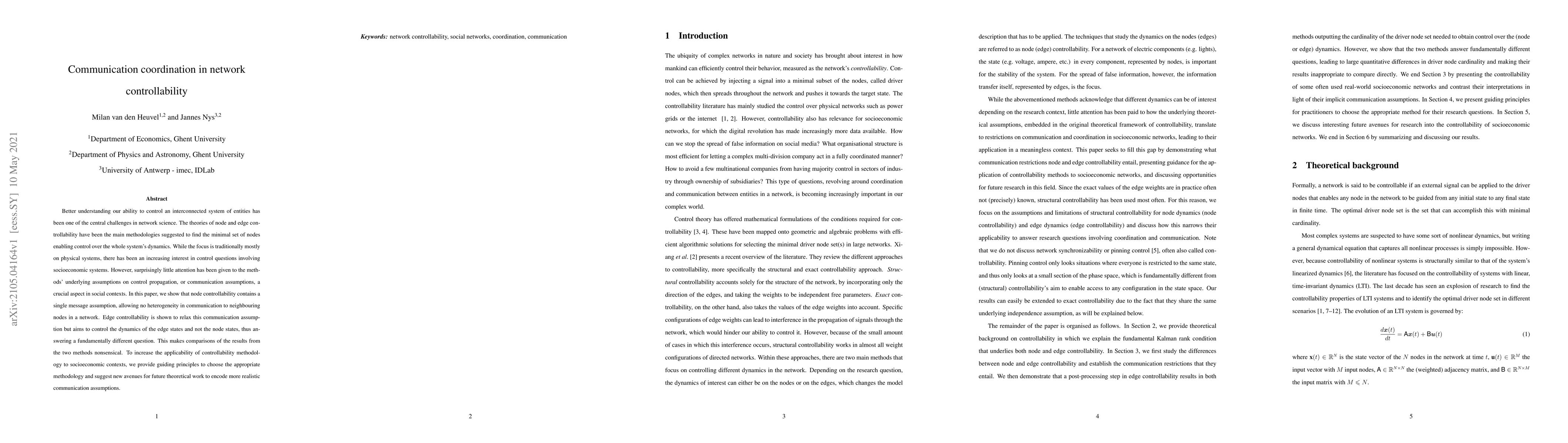 Better understanding our ability to control an interconnected system of entities has been one of the central challenges in network science. The theories of node and edge controllability have been the main methodologies suggested to find the minimal set of nodes enabling control over the whole system's dynamics. While the focus is traditionally mostly on physical systems, there has been an increasing interest in control questions involving socioeconomic systems. However, surprisingly little attention has been given to the methods' underlying assumptions on control propagation, or communication assumptions, a crucial aspect in social contexts. In this paper, we show that node controllability contains a single message assumption, allowing no heterogeneity in communication to neighbouring nodes in a network. Edge controllability is shown to relax this communication assumption but aims to control the dynamics of the edge states and not the node states, thus answering a fundamentally different question. This makes comparisons of the results from the two methods nonsensical. To increase the applicability of controllability methodology to socioeconomic contexts, we provide guiding principles to choose the appropriate methodology and suggest new avenues for future theoretical work to encode more realistic communication assumptions.