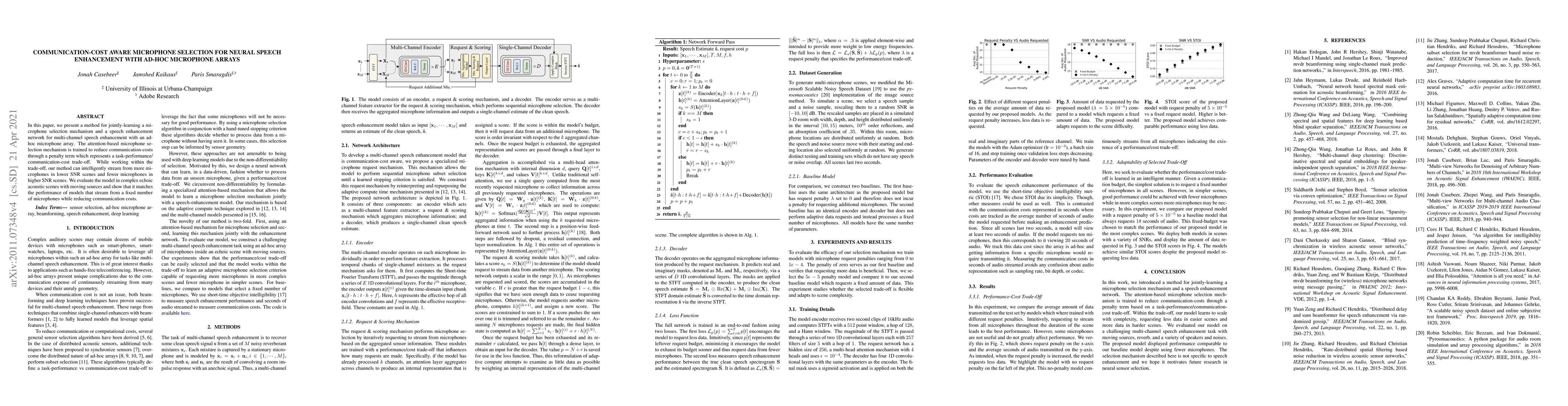This paper proposes a method for jointly learning microphone selection and speech enhancement in ad-hoc microphone arrays, optimizing communication costs via an attention-based mechanism. The approach effectively balances performance and communication costs, achieving comparable results to fixed-microphone models while reducing data transmission.