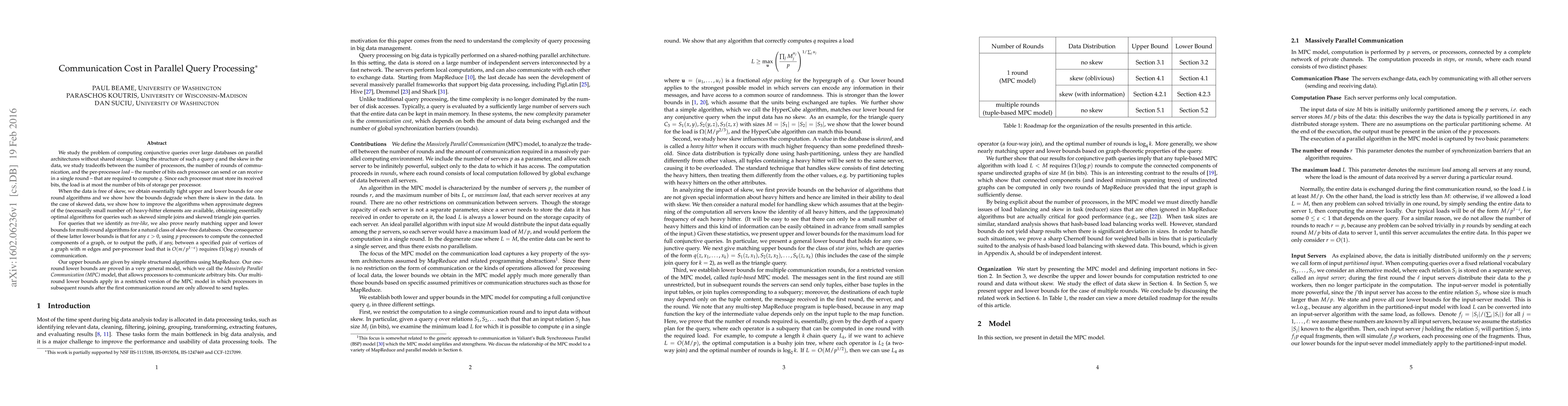 We study the problem of computing conjunctive queries over large databases on parallel architectures without shared storage. Using the structure of such a query $q$ and the skew in the data, we study tradeoffs between the number of processors, the number of rounds of communication, and the per-processor load -- the number of bits each processor can send or can receive in a single round -- that are required to compute $q$. When the data is free of skew, we obtain essentially tight upper and lower bounds for one round algorithms and we show how the bounds degrade when there is skew in the data. In the case of skewed data, we show how to improve the algorithms when approximate degrees of the heavy-hitter elements are available, obtaining essentially optimal algorithms for queries such as simple joins and triangle join queries. For queries that we identify as tree-like, we also prove nearly matching upper and lower bounds for multi-round algorithms for a natural class of skew-free databases. One consequence of these latter lower bounds is that for any $\varepsilon>0$, using $p$ processors to compute the connected components of a graph, or to output the path, if any, between a specified pair of vertices of a graph with $m$ edges and per-processor load that is $O(m/p^{1-\varepsilon})$ requires $\Omega(\log p)$ rounds of communication. Our upper bounds are given by simple structured algorithms using MapReduce. Our one-round lower bounds are proved in a very general model, which we call the Massively Parallel Communication (MPC) model, that allows processors to communicate arbitrary bits. Our multi-round lower bounds apply in a restricted version of the MPC model in which processors in subsequent rounds after the first communication round are only allowed to send tuples.