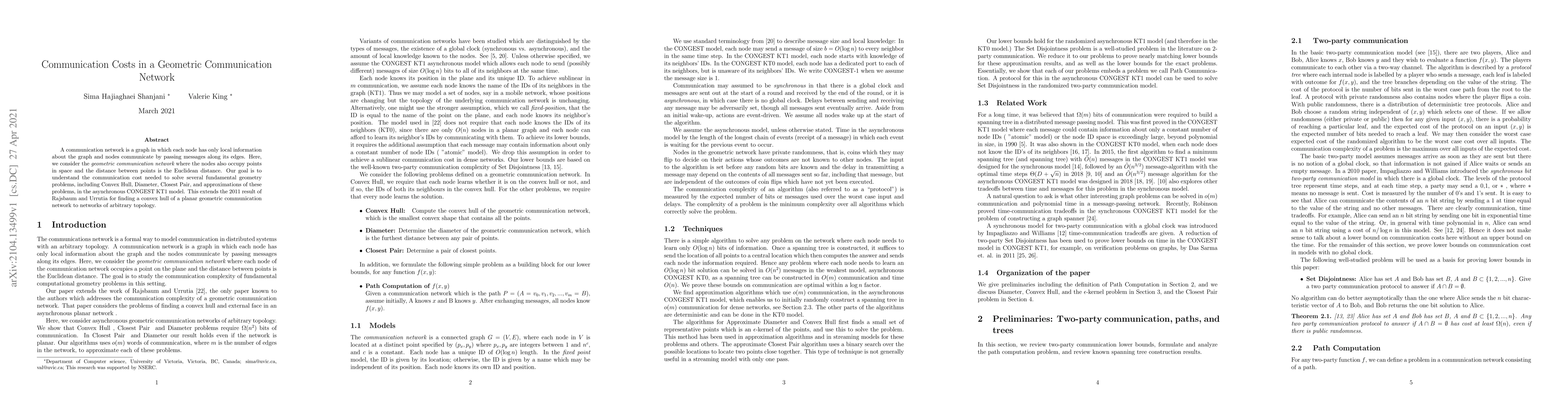 A communication network is a graph in which each node has only local information about the graph and nodes communicate by passing messages along its edges. Here, we consider the {\it geometric communication network} where the nodes also occupy points in space and the distance between points is the Euclidean distance. Our goal is to understand the communication cost needed to solve several fundamental geometry problems, including Convex Hull, Diameter, Closest Pair, and approximations of these problems, in the asynchronous CONGEST KT1 model. This extends the 2011 result of Rajsbaum and Urrutia for finding a convex hull of a planar geometric communication network to networks of arbitrary topology.